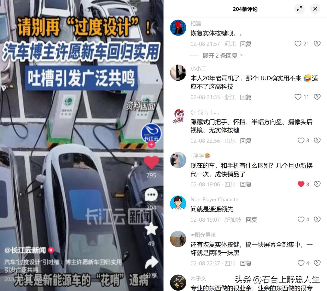 汽车过度设计引全网共鸣 最近博主吐槽的车企为创新而创新,点中了不少车主的痛点。取消实体按键换成全触摸屏、隐藏式门把手,这些设计看着新潮,实际用起来要么分神要么卡壳,甚至藏着不小的安全隐患。 这事儿看着荒唐,背后是行业里的流量博弈。为了凑高科技卖点,把汽车的工具属性越抛越远,反而把用户最在意的实用、安全踩在了创新KPI脚下。屏幕代替按键,美其名曰智能化,真要是开车时屏幕出问题,那才叫两眼一抹黑。 好在Euro NCAP 2026新规来了,核心驾驶功能必须留物理按键,不然直接扣分影响评级。这相当于给瞎折腾的车企敲了警钟,别拿创新当遮羞布,车的本质是把人安全送到目的地。 不知道接下来,有多少车企能真的把实用捡回来?