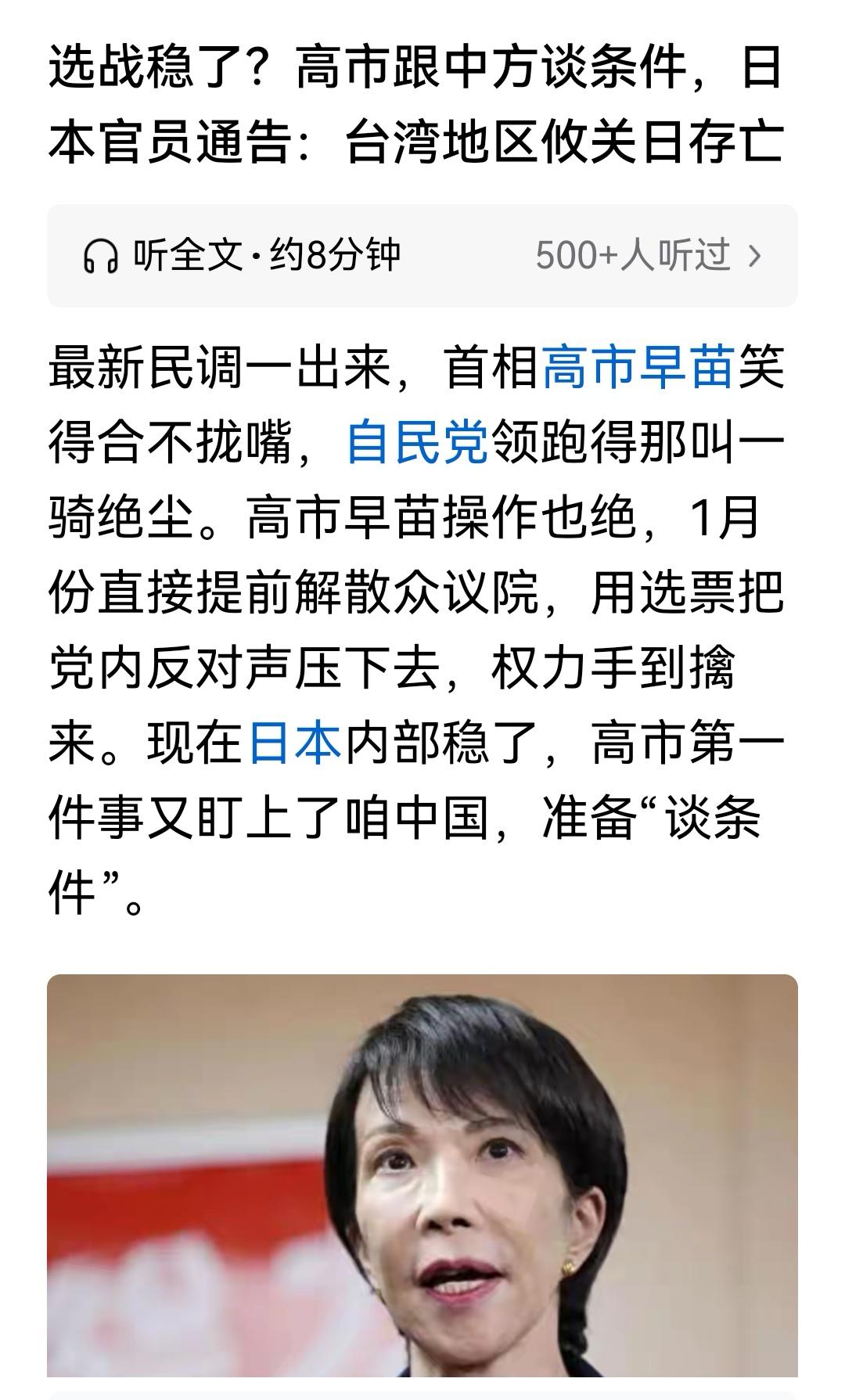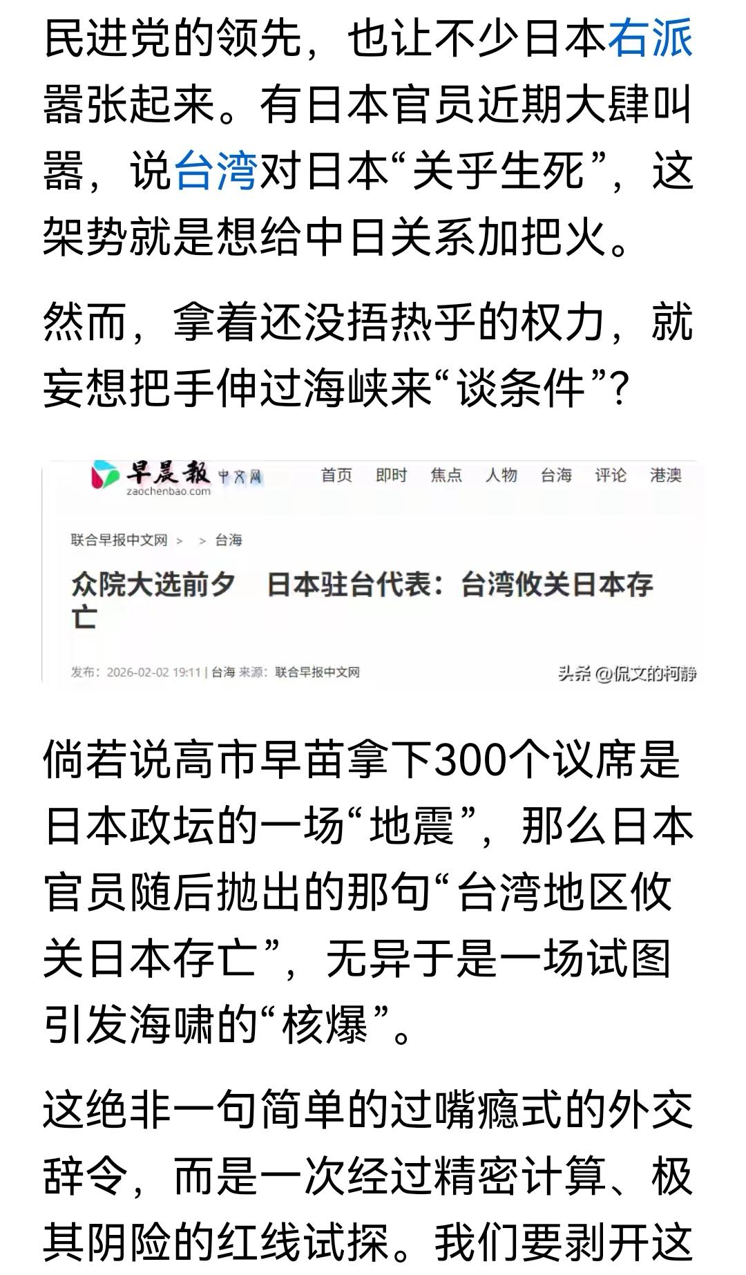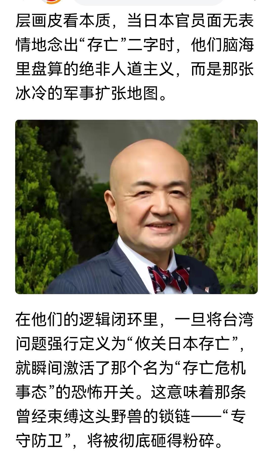 日本步步紧逼,开始是,台湾有事就是日本有事,后来是对台湾动武,可能视为存亡危机事态,现在竟然说,台湾地区攸关日本存亡。把我国台湾绑到日本的战车上了,太嚣张了!