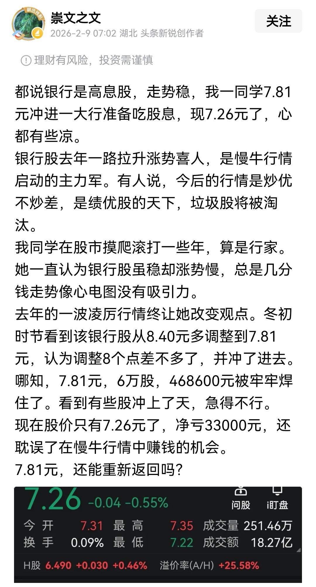 银行股持有与买入是两回事,这涉及到时间成本问题。比如工行不算贵,现在也值钱但买入需要慎重,你不知道短期会发生什么。计划持有时间很长当然可以不计较股价的小幅波动,持有时间短就需要考虑,宁可错过也不买错。比如这位的操作是典型的追高,可不是股市有经验者行为,更不是价值投资者的行为,买入价的确定需要行业内比较、还有自身纵向比较,更需要考虑“计划持有时间”。
