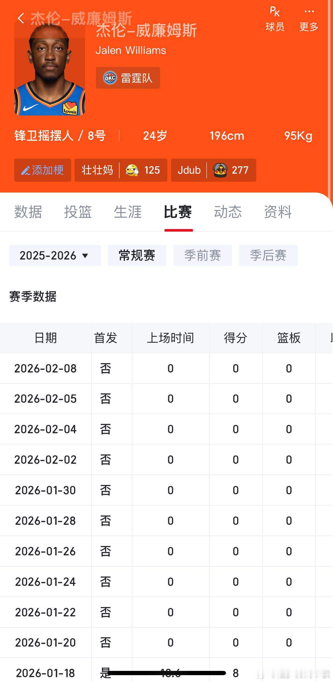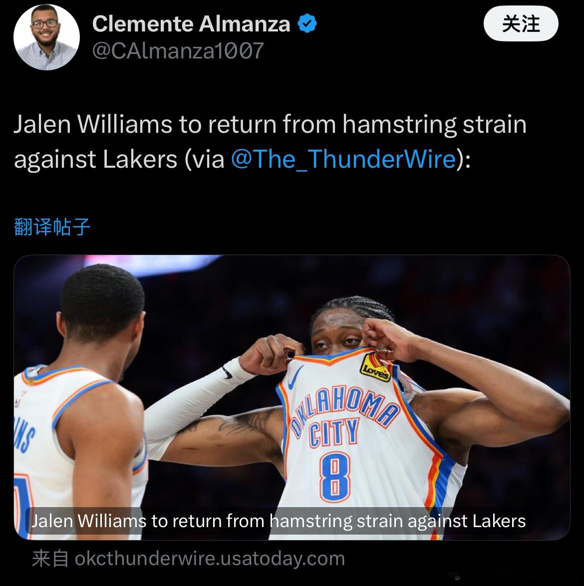 时隔三个多星期,杰伦-威廉姆斯将在明天对阵湖人比赛复出! 雷霆vs湖人