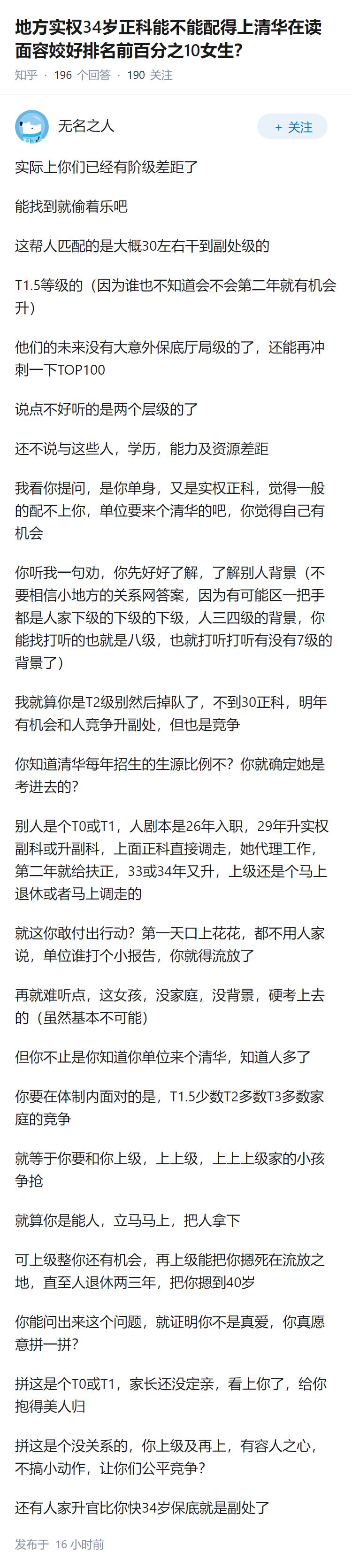 地方实权34岁正科能不能配得上清华在读面容姣好排名前百分之10女生?
