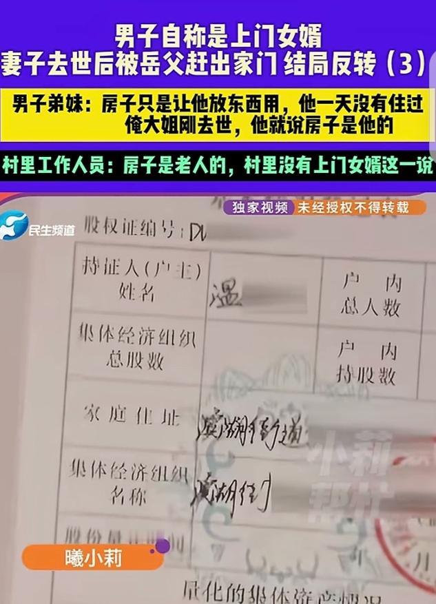 “这吃相太难看了!”河南平顶山,一42岁男子是上门女婿,妻子乳腺癌突然去世,上午办完葬礼,下午岳父就把他和12岁儿子扫地出门,把房子门焊死了。男子崩溃了,哭的鼻涕一把泪一把,说白为这个家付出17年,房子是他的,凭啥把他赶走?岳父:我有儿子,咋可能招上门女婿?你把上门女婿的文件拿出来。 岳父一番话,让事态大反转,真相惊呆众人。 据温先生讲述,他原本是临县人,当年因为种种原因,做了岳父家的上门女婿。 刚结婚那会儿,他和妻子没有自己的房子,是岳父拿出这套老宅让他们安身立命。 起初,他的户口落在了岳父的大家庭里,直到2018年,他才将户口迁出来顶门立户,在他看来,从户口迁出的那一刻起,这套他住了多年的房子,就理应归他所有。 婚后,温先生和妻子的日子过得还算安稳,不久后就有了一个儿子,一家三口的幸福时光,却在儿子6岁那年戛然而止——妻子被查出患有乳腺癌。 从那以后,温先生便放下手头的琐事,一心陪着妻子四处求医问药,陪着她熬过了整整6年的抗癌时光。 可命运终究没有眷顾这个不幸的女人,2025年11月9日,妻子还是没能扛过病痛的折磨,撒手人寰,留下温先生和12岁的儿子相依为命。 温先生本以为,自己为这个家付出了17年,又陪着妻子熬过了漫长的抗癌路,就算没有功劳也有苦劳,岳父一家就算不看他的面子,也会看在他照顾妻子多年、又带着年幼孩子的份上,给他留一条生路。 可他万万没有想到,妻子的葬礼刚结束,岳父就彻底撕破了脸皮,态度发生了180度的大转变,直言要收回房子对外出租,逼着他和儿子立刻卷铺盖走人。 见温先生不肯妥协,岳父没有丝毫犹豫,直接找来工人,将房门焊得严严实实,还在门上贴了一张纸条,上面写着“撬门破锁者后果自负”,为了防止温先生强行进门,甚至特意安装了监控,做得十分决绝,没有给温先生留下任何余地。 走投无路之下,温先生找到了媒体,希望能借助媒体的力量,为自己和儿子讨一个公道,诉说自己的委屈和不甘。 可让人没有想到的是,随着记者的介入,事情的真相逐渐浮出水面,一场看似悲情的“被逐事件”,也迎来了彻底的反转,温先生口中的“委屈”,渐渐被越来越多的证据推翻。 小姨子更是气愤不已,直言人要脸树要皮,温先生的所作所为实在太过过分,不仅多次撬岳父家的门、别锁,还先后报了十几次警闹事,分明是想通过这种极端的方式,逼迫岳父把房子给他。 除此之外,围观的村民也纷纷站出来作证,说他们根本不认识温先生,温先生并不是本村人,而且这套老宅常年无人居住,根本不像温先生所说的那样,他在这里住了17年。 村民们还补充说,这套老宅原本是岳父的产业,后来推倒重建的时候,温先生既没有出资,也没有出力,甚至连重建的事情都不知情,这套房子和温先生之间,根本没有任何关系。 小舅子媳妇还特意提到,这套老宅没有水、没有电、也没有厕所,根本不具备居住条件,温先生所说的“住了17年”“住了一年”,全都是谎言,根本经不起推敲。 面对众人的反驳,温先生依旧不肯妥协,他坚持认为房子是自己的,还拿出了农村集体股权证和相关证明,直言户主是他,股权证上也写着他的名字,不管他住了多少年,这套房子都理应归他所有。 不过,温先生的这番说辞,很快就被岳父拿出的一份证明推翻了——岳父拿出了村委会出具的相关文件,明确证明这套房子的归属权属于自己,温先生本身没有宅基地,如今之所以来闹事,就是想在女儿去世后,分一杯羹、霸占不属于自己的财产。 面对村委会的核实结果和确凿的证据,温先生终于不再辩解,默默低下了头,之前的委屈和激动,也渐渐被沉默取代。 后来,在记者的调解下,温先生终于说出了自己的心里话,他之所以如此执着于这套房子,并不是单纯的想霸占财产,只是不想让刚失去母亲的儿子再受委屈,他从小就没有母亲,深知没有母亲的苦楚,不想让儿子重走自己的老路。 得知温先生的想法后,小舅子媳妇也主动表态,温先生儿子的户口落在了村里,该属于孩子的合法权益,就算温先生不争取,他们也会全力为孩子争取,绝不会委屈孩子分毫。 同时,小舅子媳妇还表示,温先生的东西还锁在房子里,他们可以给温先生两个月的时间,让他慢慢搬离物品,就算姐姐不在了,他们和温先生依旧是亲戚,以后该走动还是会正常走动。 最终,温先生也作出了承诺,以后不会再采取撬门、报警等过激行为,遇到事情会和岳父一家理性沟通、好好商量。 一场因房子引发的闹剧,在记者的调解下终于平息,只是这场闹剧,不仅消耗了大众的同情心,也让原本和睦的亲戚关系,变得十分尴尬,实在令人唏嘘不已。 今天的分享到这里就结束了,大家对此事有何看法,欢迎在评论区留言和讨论,感兴趣的可以点击头像加关注,我将每日更新优质内容,我们下期见。