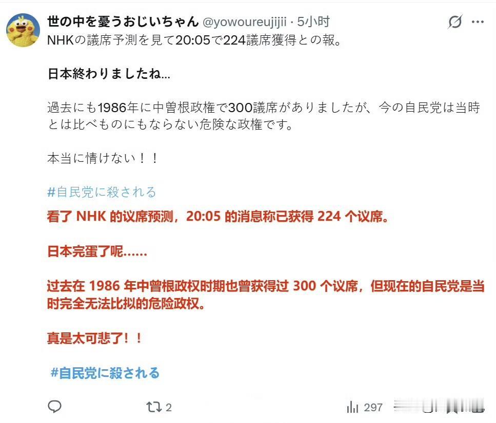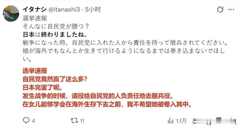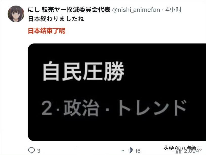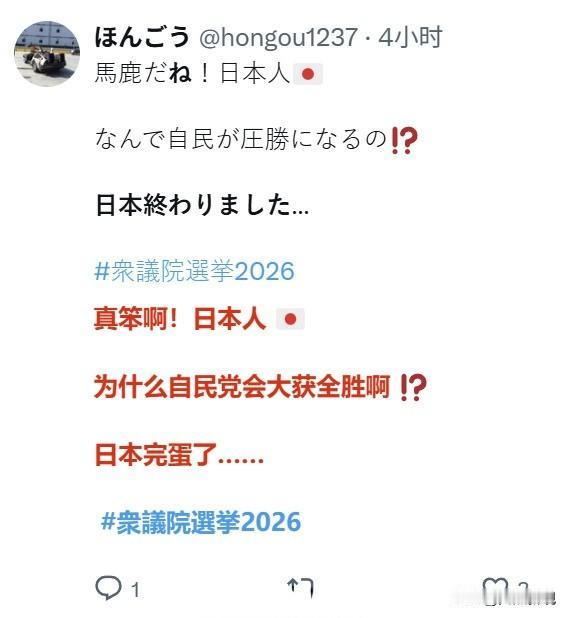 高市早苗大获全胜,日本人觉得自己国家要完了。这次日本自民党罕见的以超过2/3的选票大获全胜,日本国内右翼分子集体高潮,但聪明的人却从中嗅出了危险,要知道当年希特勒也是民选上台,但最终却带领德国人民走向了毁灭。高市早苗手中的权利越大其野心就会越膨胀,对日本而言绝非好事。