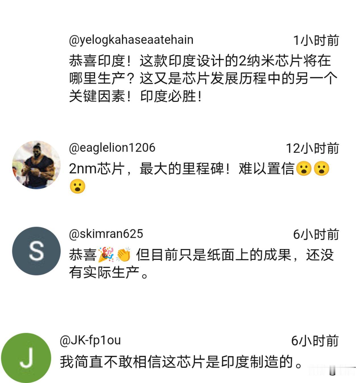 仅次于韩国!印博主:印度已经实现反超,领先于中美两国。 2月9日,一位印博主表示,印度在芯片设计方面已迈入2纳米时代,实现了对中美两国的反超,成为继韩国之后,全球第二个有能力设计出2纳米芯片的国家。 说到芯片设计,美国优势明显。全球约60%的芯片设计收入集中在美国,其在EDA(电子设计自动化)软件和IP核(知识产权核)方面拥有垄断性优势。而我国同样拥有自己的优势,在某些特定芯片设计方面处于领先地位,综合实力仅次于美国。而中美两国,也有设计的2纳米芯片的能力。 很显然,与中美两国相比,印度的整个芯片产业还有较大的差距,更谈不上在设计方面反超。 闻讯后的印度网友不淡定了,热议由此引发…