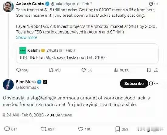 65倍暴增狂想!马斯克放话:特斯拉市值冲击100万亿美元 1.5万亿到100万亿,中间差了65个身位!马斯克却说:这事儿能成? 2026年2月9日,特斯拉CEO埃隆·马斯克在社交平台X上回应投资者提问时放出“狠话”:特斯拉市值有望达到100万亿美元,虽需“巨大努力和十足运气”,但“并非不可能”。 此言一出,全网炸锅。要知道,目前全球市值前十的公司——包括苹果、英伟达、微软等科技巨头,总和也不过26万亿美元。马斯克的野心,显然不止于造车。 在他描绘的蓝图中,特斯拉早已不是传统车企,而是集人工智能、自动驾驶、人形机器人、能源存储于一体的超级科技生态。方舟投资掌门人凯茜·伍德更是力挺:特斯拉拥有独家道路数据、Neuralink的生物数据、X平台的对话数据,三者融合将构建无人能及的AI护城河。 更惊人的是,马斯克旗下企业正加速协同:特斯拉投资xAI,SpaceX收购xAI,技术与数据互通的“马斯克宇宙”正在成型。 但梦想很丰满,现实却很骨感。特斯拉2025年交付量同比下降8.6%,自动驾驶落地屡遭监管质疑,机器人“擎天柱”尚未量产创收。 100万亿美元,是天方夜谭,还是未来可期?至少现在,马斯克仍在用“画饼”点燃资本的想象力。 (信息来源:同花顺财经、东方财富)