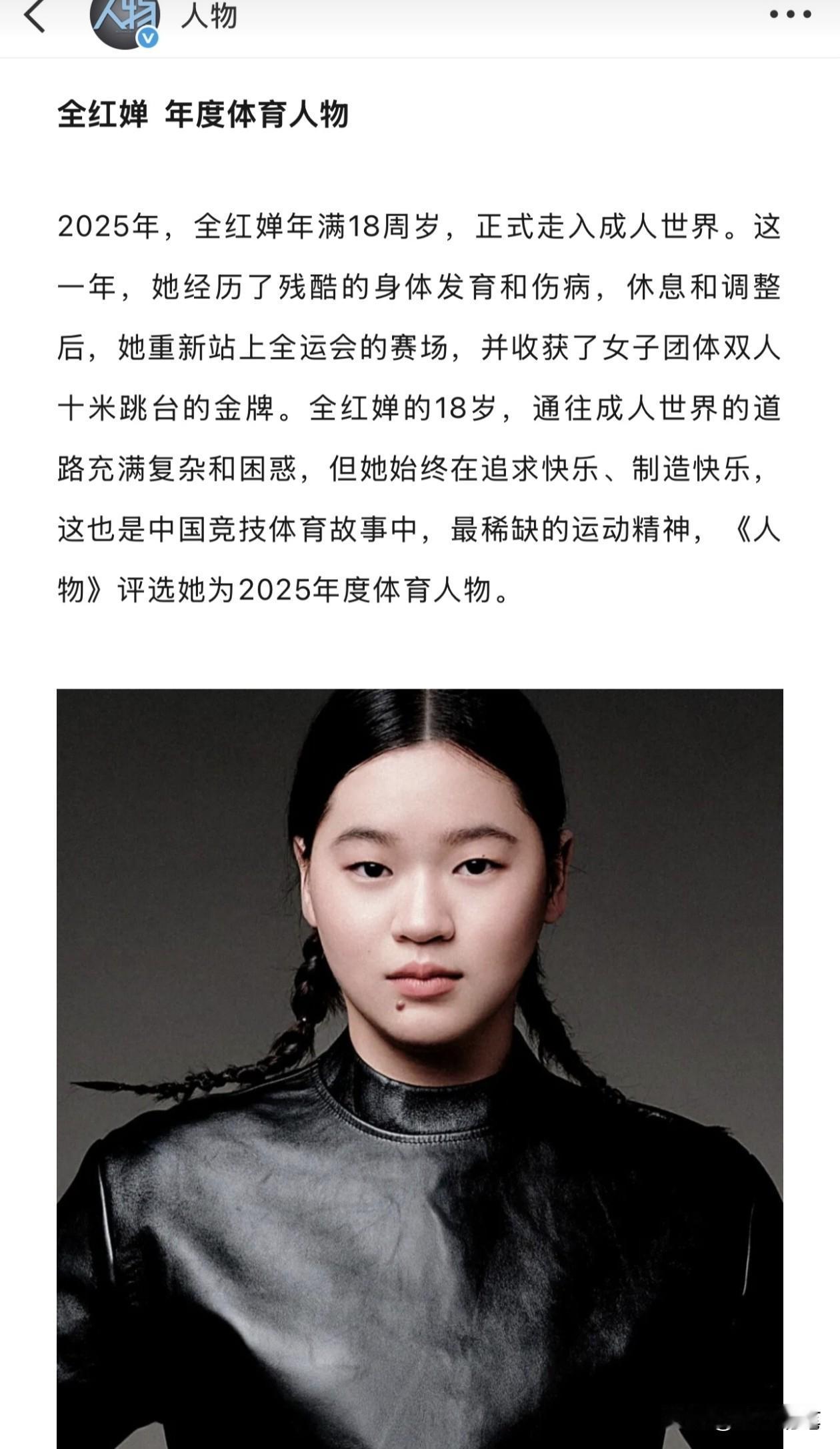 全红婵被评为2025年度体育人物! 在完全没有路透,事前完全没有消息透露的情况下,现在突然宣布全红婵入选《人物》当中的年度体育人物,真的令人既意外又惊喜。 要知道《人物》的年度人物,其权威性是非常高的,全红婵作为体育人物入选,可想而知全红婵的影响力之大了。而且即使在异常低调的2025年,全红婵还能够入围年度人物,足以说明她的人格魅力。 而这次《人物》对全红婵入选的理由有这么一段话个人觉得是非常精准的,“全红婵的18岁,通往成人世界的道路充满复杂和困惑,但她始终在追求快乐、制造快乐,这也是中国竞技体育故事中,最稀缺的运动精神。” 全红婵一直以来虽然面对自己个人的发育难关压力和网络上的一些不友好的声音,但是只要看到全红婵出现在镜头面前,大家都会被她的笑容和可爱的个性感染。全红婵从不在公开场合抱怨,一直只传递正能量,追求快乐和制造快乐,这真的正是社会上的大家都需要的也稀缺的精神。