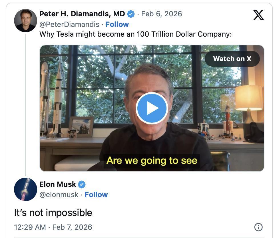 特斯拉市值有望达100万亿美元?马斯克:并非不可能 一些看好特斯拉前景的投资人预测,特斯拉最终市值可能达到100万亿美元,这是啥概念呢,目前全球市值排名前十的公司——英伟达、苹果、Alphabet、微软、亚马逊、台积电、Meta、沙特阿美、博通和特斯拉加起来的市值是26万亿美元。 ARK的木头姐认为,考虑到特斯拉的发展前景,100万亿美元很合理,毕竟在人工智能的世界里,数据是最重要的,而特斯拉有道路数据,Neuralink有脑机数据,X(推特)有社交平台数据,所以特斯拉市值达到100万亿美元是可预期的。 马斯克去年年底表示,他手下的所有公司都在走向融合,特斯拉投资了xAI,SpaceX最近收购了xAI,这标志着在马斯克的监督下这些产业已经迈出了成为巨无霸公司的第一步。 在一则预测特斯拉有望成为100万亿美元市值公司的视频下面,马斯克回复:“并非不可能”。【来自懂车帝车友圈】