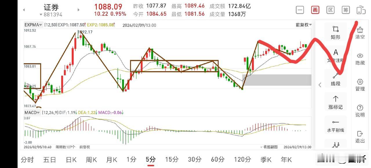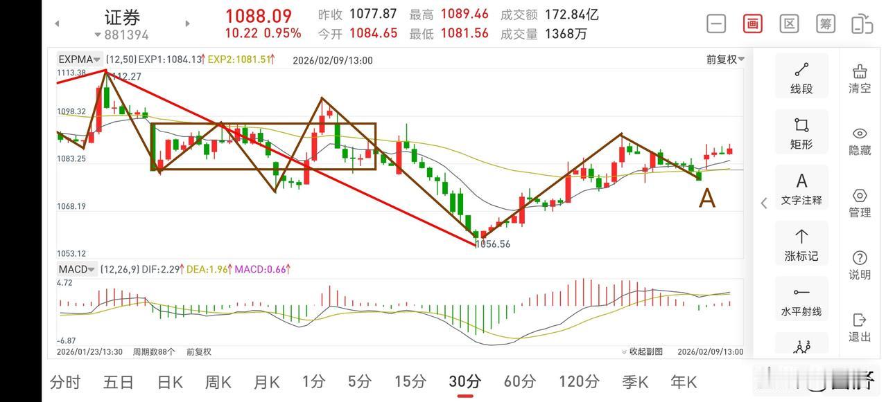 聊聊证券板块(2026.2.9) 今天股市迎来了普涨,满屏红彤彤,看来这周确实有发红包的迹象。证券板块亦是如此,回踩很浅,说明下方是有承接的,具体看一下小级别上的走势。 1.从30分钟图一上看,30分钟一笔回踩很浅,形成了30分钟的二买A点,那么下一步的防守位放在A点,之前减仓的可以在下午开盘的时候即可考虑回补仓位。 2.从5分钟图二上看,目前正在构建5分钟中枢,下午只要在构建中枢期间任何点位都是可以考虑回补仓位的,因为5分钟的中枢区间本身振幅并不大,不必去考虑最低的买点。 总体而言,走势无忧,节前小红包可期。证券板块解析 分享每天的感悟