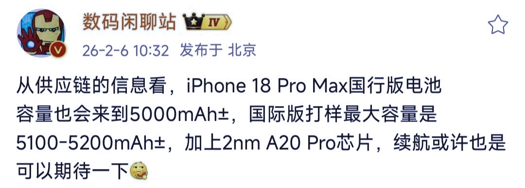 然而就当其它品牌还在忙来忙去如何应对iPhone17系列年货节大降价时,新iPhone又传来重大消息,数码闲聊站表示,从供应链的信息看,iPhone 18 Pro Max国行版电池容量会超过5000mAh,国际版更是突破5100mAh,还有2nm工艺制程的A20 Pro处理器,新机续航能力又重大提升。