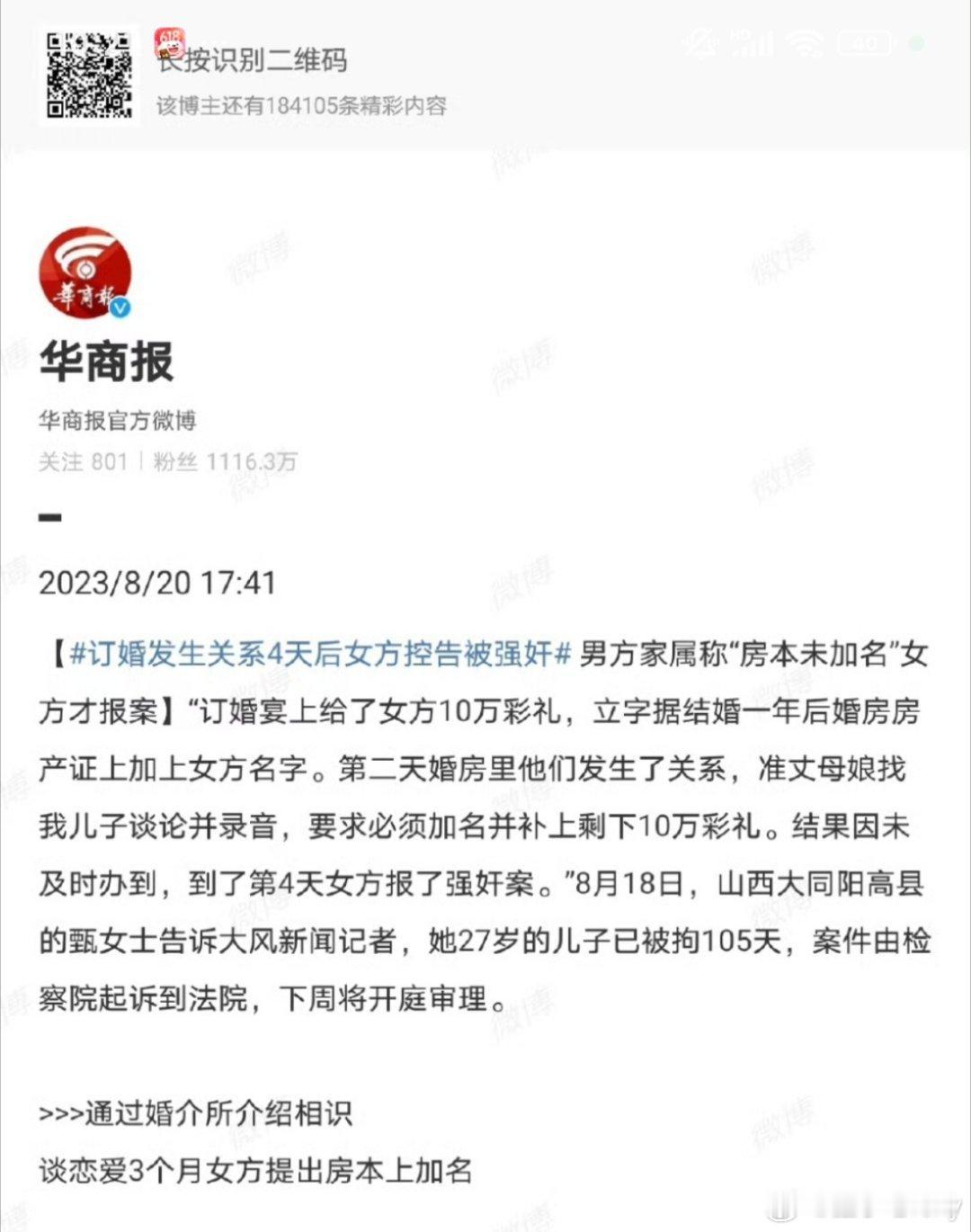 订婚强奸案电梯视频首曝光监控视频是发生关系事后,女子跑出房间,然后男子才去拉拽的,这次的媒体报道隐去这一信息,营造出男子是事前“强制”女子发生关系,连前后都能颠倒。我们再回忆一下当时的案件细节,女方事后并没有立即报警,而是提出房本加名并索取十万元(图三)。事前的监控显示两人亲密搂抱(图四),怎么不披露一下事前两人在电梯里的监控呢?那么这次曝光的视频里女子极力反抗,到底是真的因为恐惧(和事前的行为左右脑互博)还是配合表演,以“撤回同意”“报警强奸”索取利益,谁能得知呢? 认定席某强奸关键证据披露