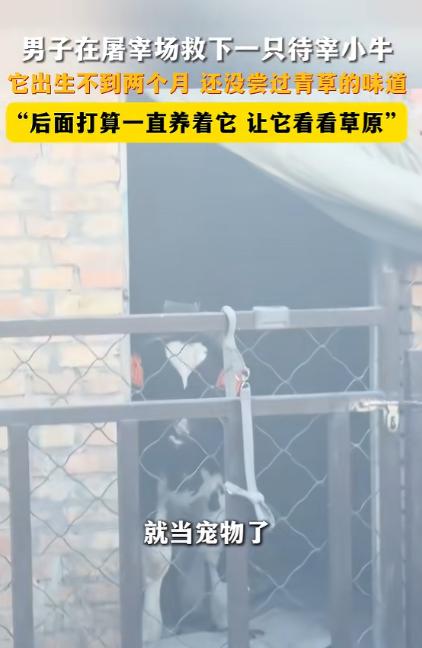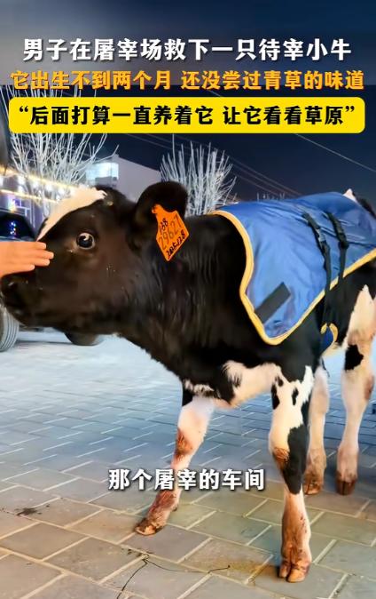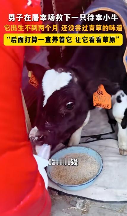 内蒙古,男子去屠宰场买肉,无意中看到一头待宰的小牛,看到牛耳朵上的牌子,男子心里一酸,毅然花1200元将它买了下来。 临近过年,前往屠宰场买年货的人们络绎不绝,当地一位男子循着往常的习惯来屠宰场挑新鲜的牛羊肉,想着囤点肉备着。 走着走着就到了屠宰车间,这里大多是体型健硕的大牛,唯有角落里的一个矮圈里,缩着一头小小的牛犊,一下子揪住了他的目光。 这头小牛看着身形单薄,站在圈里还有些摇摇晃晃,工人过来称了称,体重刚 80 斤左右,小小的身子和周围高大的肉牛形成了鲜明的对比。 一双圆溜溜的眼睛怯生生地看着来往的人,见有人靠近,还下意识地往圈角缩了缩,看着格外可怜。 男子走近了才发现,这头小牛的耳朵上钉着一个塑料耳标,上面的数字和编码清晰地标注着它的出生信息,一眼就能看出这头小牛来到世上还不到 2 个月。 看着这个数字,男子的心里猛地一酸,他常年在牧区生活,见过不少刚出生的牛犊,知道这个月龄的小牛,本该在温暖的犊牛舍里待着,喝着温热的奶水,吃着专门的犊牛开口料,连外面的青草是什么味道都还没尝过。 按照牧区的养殖规矩,不到 2 个月的牛犊还没到采食青草的阶段,本该被养殖户细心照料着,每日喝着 20 到 30℃的温水,一点点适应精饲料,却不知为何被送到了屠宰场的待宰区,等着迎来本不该属于它的结局。 男子忍不住向屠宰场的工人打听这头小牛的情况,工人说这头小牛是刚被送过来的,按规矩也是要进行屠宰处理的,男子听着心里更不是滋味,看着小牛那双无辜的眼睛,心里做了决定,要把这头小牛买下来。 他和屠宰场商量了价格,最终以 1200 元的价格定下了这头 80 斤的小牛,这个价格不算低,可男子没有丝毫犹豫,当即付了钱,只想着赶紧把这头小生命从待宰区带出去。 周围的工人见了,都觉得有些意外,毕竟来屠宰场的人都是买肉的,很少有人会花 1200 元买下一头待宰的小牛犊,还是打算自己养着。 面对旁人的目光,男子只是笑着摸了摸小牛的头,他说自己家里就在牧区,有院子,也懂些牛犊的饲养方法,既然遇上了,就不能看着这么小的生命就此结束,接下来打算把这头小牛当成宠物一直养着。 男子把小牛领回家之后,就在网上发布视频记录自己与小牛的缘分,没曾想引起了网友们的探讨。 不少人都不理解为什么这个小牛才这么小,屠宰场就要把它给宰杀掉,有网友在评论区做出了解释。 他表示这种小牛应该是奶牛场淘汰的,因为是公牛所以没有用处,就被奶牛场送到屠宰场也是情有可原的。 这头 50 多天的小牛犊,没尝过青草的滋味,却在冰冷的屠宰场里,遇到了愿意为它花 1200 元的温暖,从此有了一个能遮风挡雨的家,有了一个会好好呵护它长大的人。 往后的日子,它会在牧区的草原上,踩着青草,晒着太阳,安安稳稳地长大,做一头被捧在手心的宠物牛,再也不用面对那些冰冷的围栏和未知的恐惧。 对于这件事,您有什么想说的吗?欢迎评论区留言讨论。 信源:南昌西湖发布2026-02-08——《2月6日 内蒙古。男子在屠宰场救下一只待宰小牛,它出生不到两个月还没尝过青草的味道,"后面打算一直养着它让它看看草原”。》