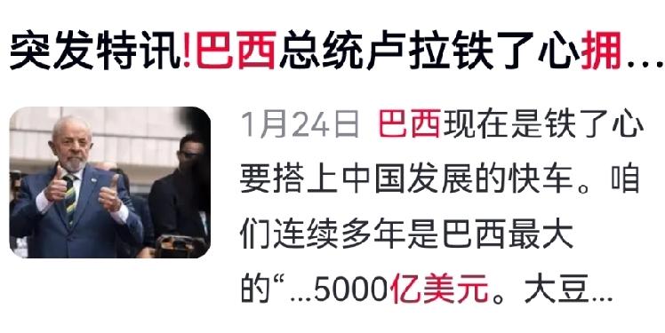风向突变!巴西彻底“硬气”了,无视美国警告,坚定拥抱中国。为什么?1710亿美元的贸易大单摆在眼前——跟美国,只有空头支票加关税大棒;跟中国,却是真金白银与合作实惠。 美国想拉拢矿产联盟围堵中国,反倒加速了巴西向东转。中国已向巴西基建投入超40亿美元,新能源企业纷纷落户。实实在在的利益,让巴西看清谁是真正的伙伴。 巴西不仅对华扩大出口,更推动南方共同市场向中国敞开大门。眼看邻国乌拉圭借中国机遇快速发展,巴西再不等候——大豆、肉类等资源急需稳定市场。 这一波“弃美投中”绝非偶然。当拉美国家纷纷向东看,美国后院的这场“变局”,或许才刚刚开始。 对此你怎么看?