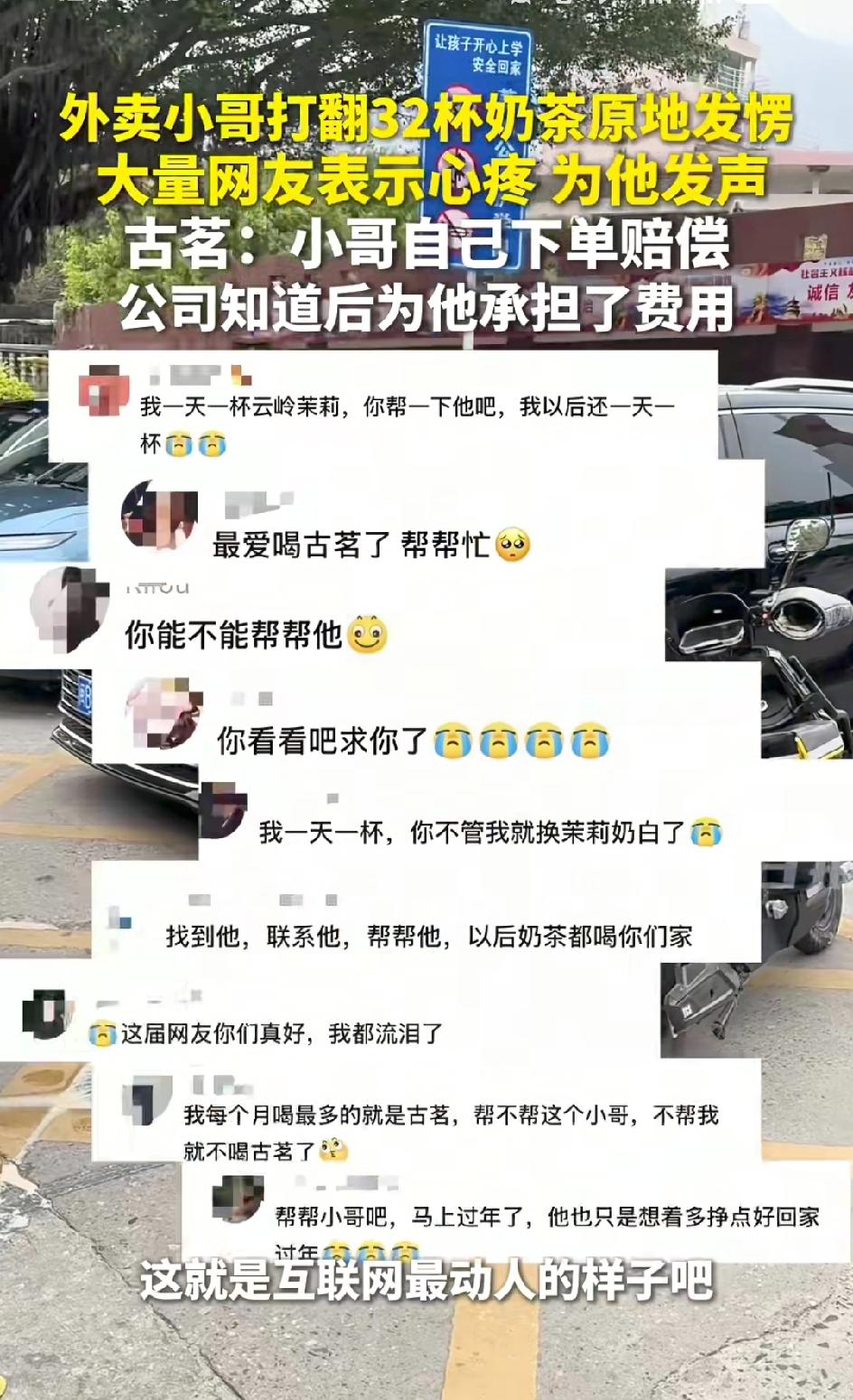 一点都不值得感动! 若不是网络流量和“舆论压力”,品牌方真的会为外卖小哥打翻的这32杯奶茶买单吗? 如果这件事没有被曝光,最后绝对是小哥默默扛下所有。我敢说,品牌方绝对不会搭理这件事。 现实就是这么残酷! 他们解决的不是几杯奶茶问题,而是一道公关难题。满足公众情绪、塑造负责任形象、顺势完成一波正向传播——这才是很多“暖心结局”背后的商业逻辑。 假如这件事即使被曝光了,但也没有流量,不会给品牌方带来舆情或利益。那最后的结局,也肯定还是得外卖小哥自己承担,这就是现实! 但话说回来,外卖小哥的品质是值得肯定的,遇事不逃避不推诿,积极面对,先道歉再承担责任。这种品质在当下社会,是非常难能可贵的!