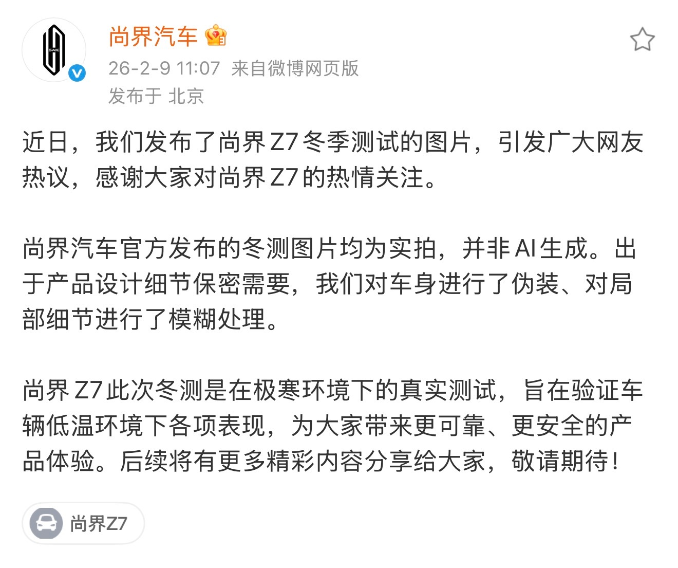 尚界汽车辟谣冬测图片为AI生成划重点:官方发布的冬测图片均为实拍,并非AI生成。出于产品设计细节保密需要,我们对车身进行了伪装、对局部细节进行了模糊处理。