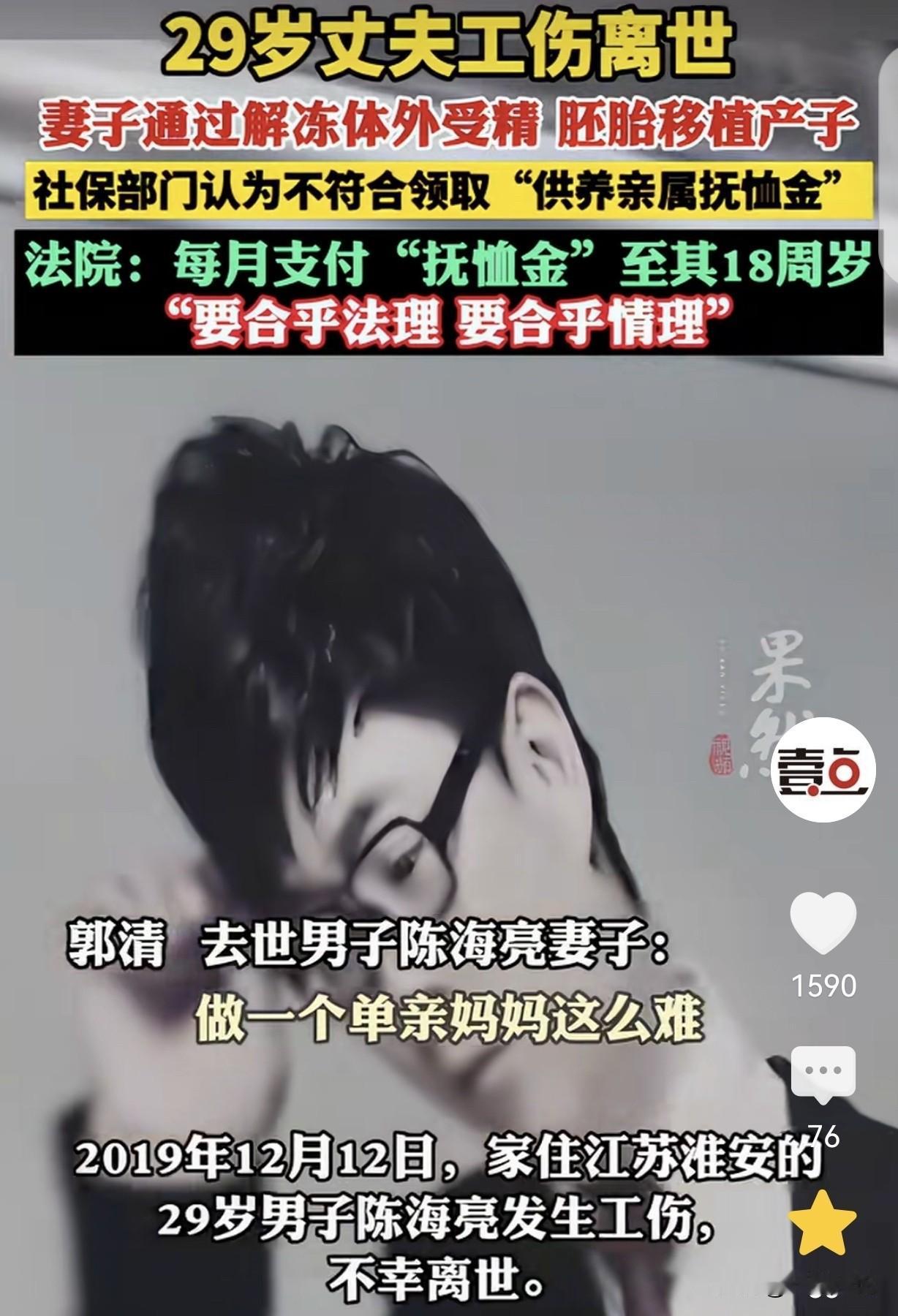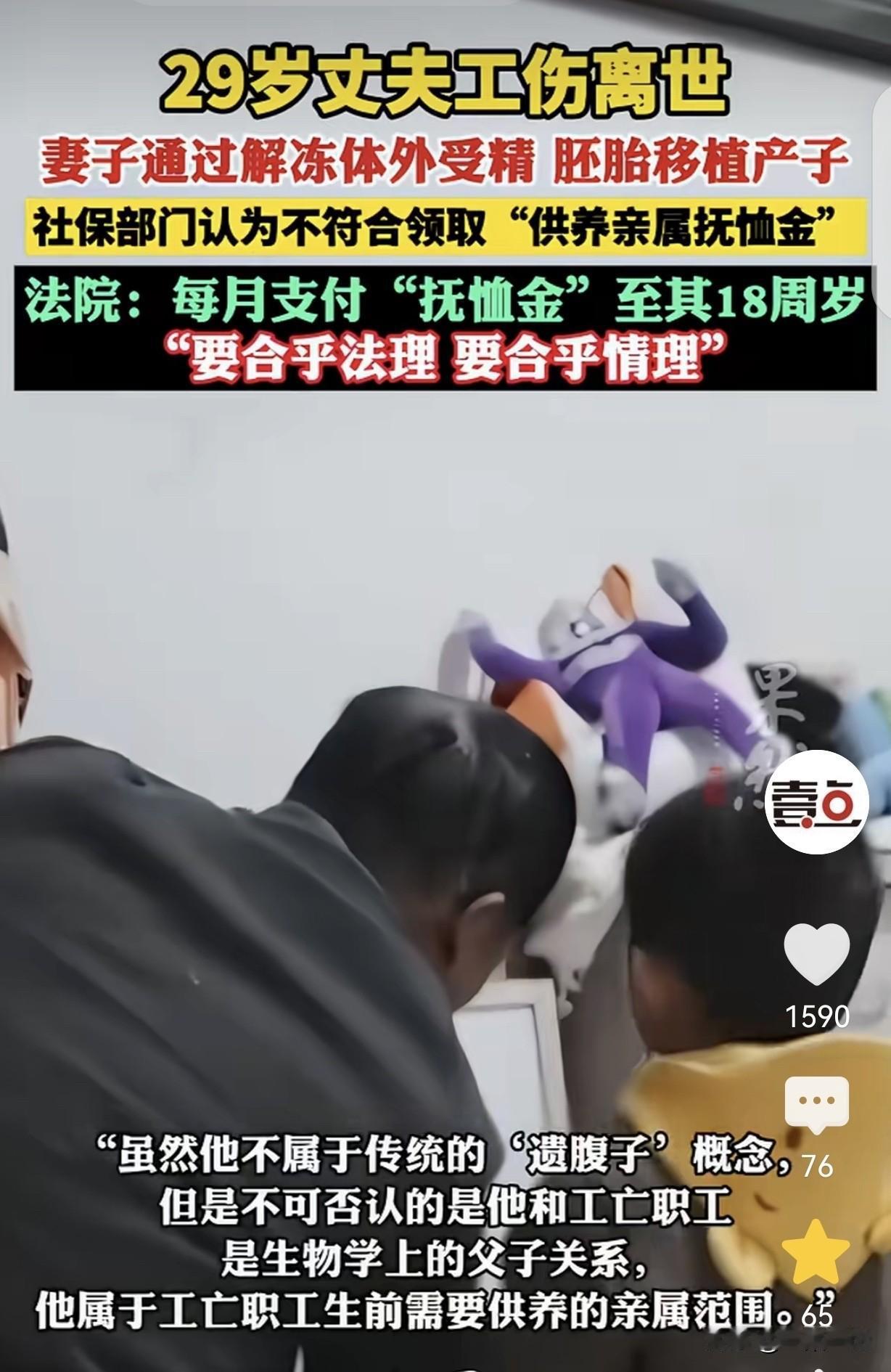 江苏淮安,一女子29岁的丈夫工伤离世,丈夫生前,夫妻俩在医院做试管,冷冻了胚胎,3天后就是做手术的日子,女子决定继续做手术,给丈夫留个后,孩子出生后,女子申请“供养亲属抚恤金,”却被拒绝,女子一纸诉状起诉到法院。法院判决出乎意料。 郭女士的丈夫陈先生工伤离世,她犹如晴天霹雳,悲痛欲绝。 丈夫才29岁呀,这么年轻就英年早逝,他们幸福的婚姻生活才刚刚开始,她还没丈夫生下一儿半女,她却再也等不回下班的丈夫。 还好,郭女士在丈夫生前,他们准备在医院做试管,保留了胚胎,而且,再过三天,就是手术的日子。 郭女士思来想去,决定继续手术,为亡夫留个后,她的这个决定石破天惊,让家人亲戚吃惊不小,一个单亲妈妈,带一个孩子谈何容易? 如今,养一个孩子要花很多钱,夫妻俩挣钱都不够孩子花,从小养大,不仅花钱付出的精力也很大。 更何况,郭女士如果生了孩子,没办法出去工作,也没收入,怎么养孩子? 再说了,郭女士年纪轻轻,以后还得再婚,她带个拖油瓶,哪个男人敢接盘? 即使郭女士决定不再婚,孩子从小生活在单亲家庭,对他成长也不好。 家人觉得郭女士是脑袋一个,太冲动了,纷纷劝她三思而后行,但郭女士主意已定,谁说她都不听,还是执意生了孩子。 生完孩子后,郭女士申请“供养亲属抚恤金,却被相关部门拒绝了,理由是郭女士的孩子,不符合领取资格。 郭女士起诉到法院,法院审理后认为,既要合乎法理,又要合乎情理,那么法院该如何判决呢? 有人说,当地要给予单亲母亲鼓励与支持,体外受精胚胎移植产子,这是对未来的贡献。 无论怎么样,什么过程就应该付,因为需要大家生娃,生娃都补贴了,所以对这种情况就应该给,否则与整体不符。 不管别人怎么说,我觉得这个女人太伟大了,男方父母至少很感谢她。 文中说本来就做了试管,胚胎3天后移植,结果男子发生了工亡!其妻子后来正常移植存活了才生了孩子,按照时间发展的顺序这个孩子合乎情理!应该抚养! 工伤致死了,还好死前面已经在做试管了,而不是遇到意外了才去做试管!这个是一个已经发生了的事遇上了意外工伤!法院应该支持。 郭女士的选择,我特别能理解。丈夫刚走,那个冷冻的胚胎,就是和他仅剩的念想,哪怕知道单亲妈妈的日子有多难,她也想留住这个孩子。 那些劝她放弃的人,说的都是现实,可现实哪里能抵得过心里的牵挂。 相关部门一开始拒了申请,也不是完全没道理,毕竟法条里没明确说冷冻胚胎生的孩子算遗属,但这也不能说孩子就不该被照顾。 法院的判决算是给了所有人一个交代,法里也该有情。 孩子已经生下来了,他和爸爸的血缘是真的,他得吃饭上学,不能因为出生方式特殊就被区别对待。 郭女士赌上后半辈子养孩子,要是连这笔抚恤金都没有,也太让人心寒了。 《因工死亡职工供养亲属范围规定》第2条规定,因工死亡职工生前提供主要生活来源、无劳动能力的亲属可列为供养亲属。 该案中,冷冻胚胎移植属于与丈夫生前共同确定的生育计划,孩子与工亡职工存在血缘关系且无劳动能力,法院突破“遗腹子”的传统限制,将其纳入供养亲属范围,既契合法律救济本质,也体现司法温度。 最终,法院判决每月支付“抚恤金”,直到郭女士孩子18岁。 对于这件事,你怎么看? 欢迎关注@一案一论