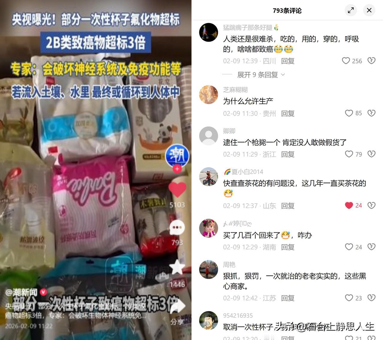 一次性茶杯检出2B类致癌物 上海消保委测了40款一次性杯,不少标称可降解的其实降解不了,还查出氟化物超标、致癌物残留3倍。专家说这些物质会伤神经和免疫系统,流入水土后,最终可能绕回人体。 这事儿看着扎心,更是行业逐利踩底线的缩影。为了防渗漏、压成本,商家偷偷加违规含氟添加剂;可降解成了随便贴的营销标签,反正消费者没能力去较真。相关管理的滞后,又给了这些产品钻空子的机会。咱们普通人哪有精力挨个检测?只能被动碰运气,难怪大伙满是恐慌和愤怒。 大家并非要一竿子打翻一船人,更希望有人把好源头关,别让低成本变成拿健康换的买卖。以后买杯具,你还敢只看包装吗?