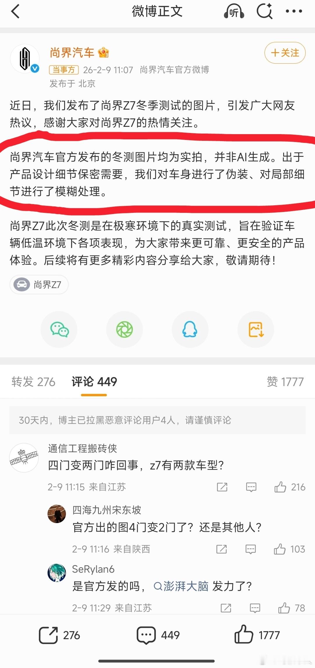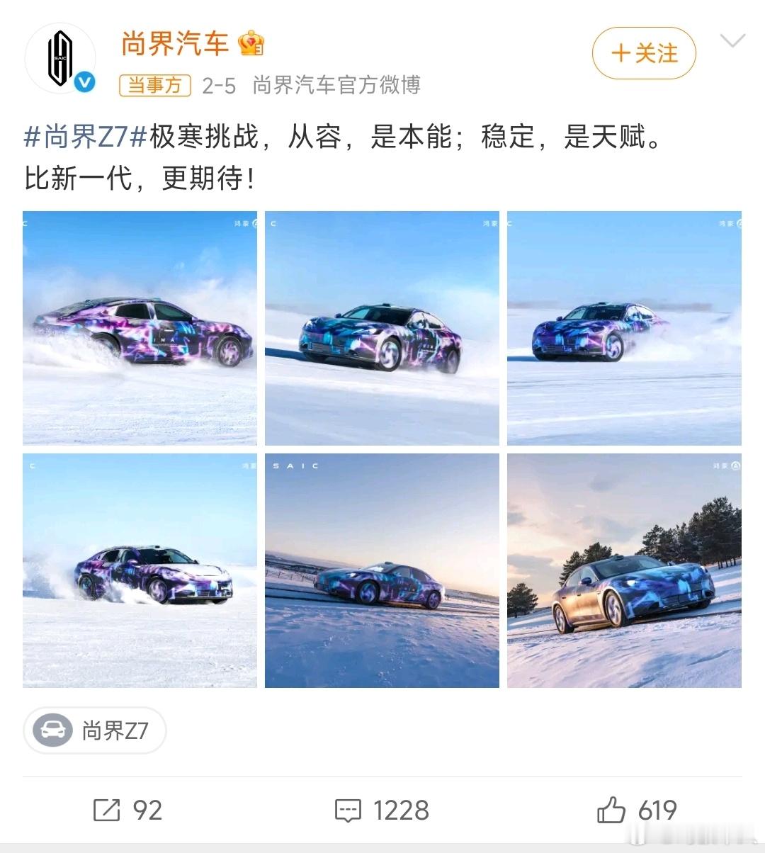 尚界汽车辟谣冬测图片为AI生成官方终于是回应了,但是声明里面唯一和大家质疑相关的就是这句 “处于产品设计细节保密需要,对局部细节进行了模糊处理 ”,其实并没有正面回复更多的细节,比如大家最关心的轮毂动态模糊,但是轮胎静止甚至胎纹清晰可见,显然是违背物理规律的,而且有的平台都提示了AI生成,这台车去极寒环境测试我相信没有人会质疑这个,但是大家好奇的是既然去了,怎么不就地拍摄一些实打实的照片视频,而是用后期,这个应该是质疑的核心......尚界汽车称冬测图片均为实拍
