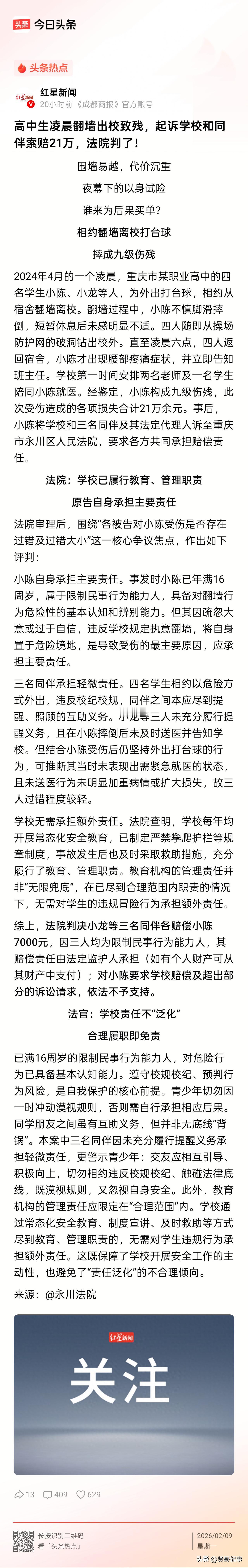 太不让人省心了!重庆,4名高中生半夜不睡觉,竟相约翻出校门去打台球。然而,一名男生在翻墙时不慎摔倒发生意外,最终导致身体九级伤残。事后,男生父母不满,觉得另外三名学生和学校对孩子的伤残都负有责任,于是将他们告上法院,索赔210000元。法院是这样判的! 男孩小陈是当地某所职业高中的一名学生。事发当天凌晨,小陈和另外三名同学打算偷偷翻出校门打台球。 于是,四人就摸黑来到宿舍外墙,打算翻墙而出。 可谁曾想,轮到小陈时,因他脚下一滑,不慎从墙上掉了下来,重重摔在地上。 当时,小陈没有特别痛的感觉,在歇了一会儿后,便跟着同伴从操场防护网的破洞钻出去。 众人一直玩到凌晨六点才回宿舍。 回到宿舍后,小陈腰腹部的疼痛感突然剧烈起来,便赶紧向班主任报告。 后来,在两名老师和一名同学的陪同下,小陈来到了医院就诊。 检查结果让人揪心,小陈伤势严重,经鉴定构成九级伤残。 好好的孩子摔成伤残,这让小陈的父母一时间难以接受,他们认为学校没看住学生,负有不可推卸的责任;而当时另外三名同学,他们相约翻墙,才造成如此后果,也同样难辞其咎。 于是,小陈的父母一纸诉状将学校、三名学生及其家长,一起告上了法院,要求共同赔偿各项损失合计21万元。 那么,学校和三名学生需要对小陈的受伤结果负责吗? 其实,明眼人都能看出来,正因为小陈和另外三名学生的顽劣,才酿成这样的结果。 小陈在事发时已满16岁,为限制民事行为能力人,能够分辨出翻墙可能面临的危险。 但小陈依然在违反学校规章制度的情况下这样做了,其本人应要承担主要责任。 对于学校来说,《民法典》第1200条规定,限制民事行为能力人在学校受伤,学校仅在未尽教育、管理职责时担责。 简单来说,对于高中生,学校不是任何时候都要对学生的受伤结果担责。 本案中,学校已开展安全教育、明确禁止私自翻墙,事发后也第一时间将小陈送医救助,尽到了管理职责。 小陈受伤是因他自身违规冒险行为所致,学校对此并无过错,故不应承担赔偿责任。 至于其他3名同学,《民法典》第1168条规定,二人以上共同实施侵权行为,造成他人损害的,应当承担连带责任。 小陈等四人相约共同实施翻墙这种危险行为,彼此之间就有互相提醒、制止危险的义务。 然而,他们明知翻墙违规又危险,不仅没劝阻小陈,还一起参与、结伴逃离,对小陈的损害发生有一定的过错,需要为此担责。 当然,由于这3名同学是未成年人,他们的责任承担则由监护人负责。 最终法院判决,3名学生需各自向小陈赔偿7000元,学校则不承担任何责任。 对于家属的这份痛心,我们虽不能感同身受,但也应予以理解。 然而,对于已满16岁的高中生而言,倘若再像低龄孩童一样缺乏规则意识、无视安全边界,一切都让学校兜底的话,未免有些太过分了。 的确,有些敬畏,有些人是实实在在要靠吃了亏才能真正记在心里、刻在骨子里。 可等到真的“摔了跤、受了伤、落下终身残疾”,再想回头、再想弥补,这时,为时晚矣。 对此,你怎么看?欢迎大家在评论区留言。(注:图片仅供示意)