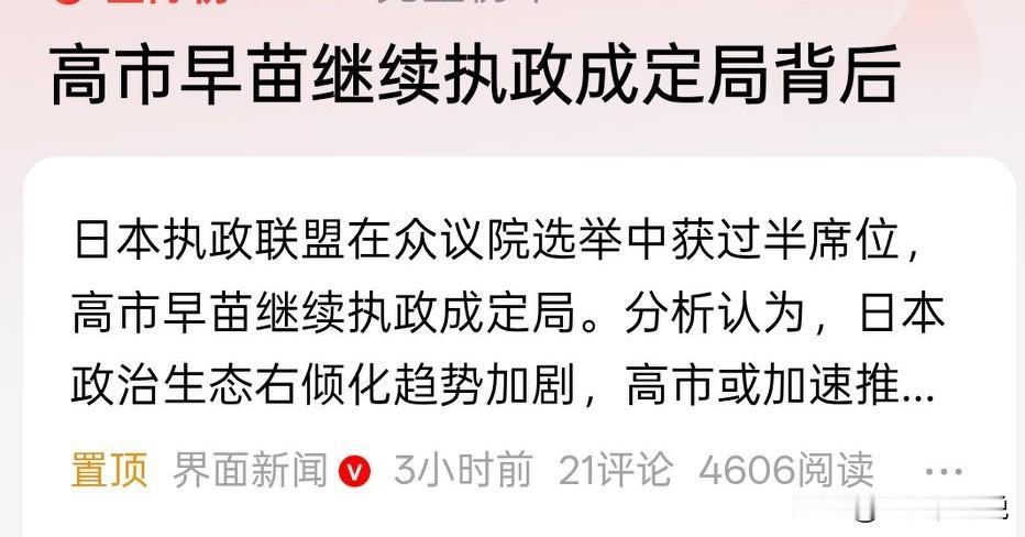 日本人的选择谁也管不了,尽管很多人不待见高市早苗这个人 现在,高市早苗继续执政,说明了人家在日本也是深得民心的 既然管不了人家,关键在于如何应对 骂解决不了问题,还需要考虑者如何应对才行 中日关系很微妙,一衣带水,非常重要