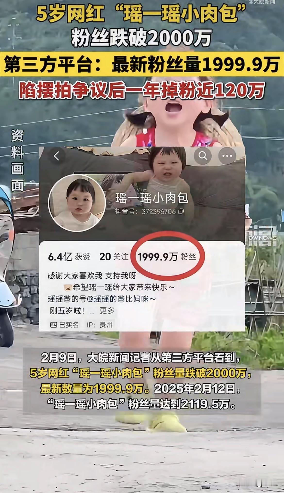 今天上午九点,一个数字的变动让很多人唏嘘:5岁的网红“瑶一瑶小肉包”,粉丝数跌破了2000万大关。要知道,就在一年前,这个账号的粉丝数曾超过2119万。近120万粉丝,用了一年的时间选择离开。 一切的转折点,都源于一年前那条引发巨大争议的“摔倒视频”。视频里,瑶瑶走着路,旁边的小男孩突然伸脚把她绊倒,孩子当场大哭。如果只是记录意外,或许还好。但孩子妈妈后来在评论区的回复,让事情变了味。她说:“因为上次瑶瑶这样我没拍到,我说让这个轻轻地弄”。 这句话,像一根导火索。无数网友的怒火被点燃,指责这位母亲为了流量,不顾孩子的安全进行摆拍。事后,母亲道了歉,承认错误,也说以后不会再让类似可能伤害瑶瑶的情况发生。但裂痕,已经产生了。 账号迅速进入了“仅允许互关朋友评论”的状态,带货橱窗也被清空。停更一个多月后再次更新时,晒出的是瑶瑶的幼儿园入学照。看起来,生活要回归正轨了。 但互联网的记忆和审视,并未停止。去年9月,瑶瑶参加活动的一些路透视频流出,部分网友留意到孩子“瘦了”、“有眼袋和黑眼圈”,看起来“疲惫”。面对这些议论,母亲在直播中显得有些激动,她说那些是拍得丑的视频,大家没看到漂亮的,就去肆意评判一个小朋友。 更令人心寒的是随之而来的网络暴力。据瑶瑶母亲透露,她们甚至收到了“活不过几岁”的恶毒诅咒,以及“智障”等不堪入耳的辱骂。一个母亲在直播中哽咽地说:“我说的‘智障’已经是好听的,更难听的我都形容不出来。” 她一度表示,如果再看到恶意造谣,在律师来之前,她不会再说一句话。 风波之中,当地妇联曾有过回应,表示瑶瑶已于2025年春季入园,适应能力强,家庭有爱,孩子身心健康发展。她们也呼吁公众给予孩子更多关爱和成长空间。 时间走到今年1月底,又一个话题上了热搜:“瑶一瑶妈妈回应老师知道女儿是网红”。在直播间里,有人问幼儿园老师是否知道瑶瑶有这么多粉丝。母亲回答:“知道呀,老师知道呀,没有特别照顾,老师对小朋友都是一样的。” 她努力地想说明,孩子在过着一种尽可能普通的生活。 然而,一个拥有近2000万粉丝的账号,主角是一个正在长大的5岁孩子,“普通”二字谈何容易。有媒体曾梳理过国外一些“育儿网红”的极端案例,其中有人从分享生活走向虐待孩子,最终被捕。这些案例揭示了一个深层问题:当亲子关系被置于商业流量之下,孩子的真实感受和身心健康,是否能永远被置于首位? 回过头看“瑶一瑶小肉包”的账号,即便经历了掉粉风波,根据去年11月的第三方榜单数据,它在亲子类账号中依然位列前排。总点赞量超过6亿,平均每一条视频都能获得百万级的点赞。这是一个依然拥有巨大影响力的“舞台”。 但这个“舞台”的中心,是一个还没来得及完全理解这个世界的小女孩。有网友翻出更早的视频,那时瑶瑶还很小,她曾误以为妈妈喜欢看她摔倒,甚至故意摔一跤,然后问妈妈:“开心吗?” 这个细节,比任何争论都更让人心里一紧。 粉丝数从2119万跌到1999.9万,是近120万人的取消关注。这些离开的人,或许是因为不认同,或许是出于担心,又或许只是厌倦。而剩下的人,依然在观看。 我们看着一个孩子在镜头前长大,看着她笑,看着她哭,看着她从踉跄学步到跑进幼儿园。我们以为我们在见证真实,但有时,连“真实”本身都可能成为被设计的桥段。我们给予关注,也施加压力;我们表达喜爱,也投射质疑。 对一个孩子来说,这到底是一种幸运,还是一种沉重的负担?当童年被装上滤镜,被剪辑,被数以千万计的人反复观看和点评时,那个真实的、需要犯错和发呆才能长大的空间,还剩下多少? 这件事,你怎么看?