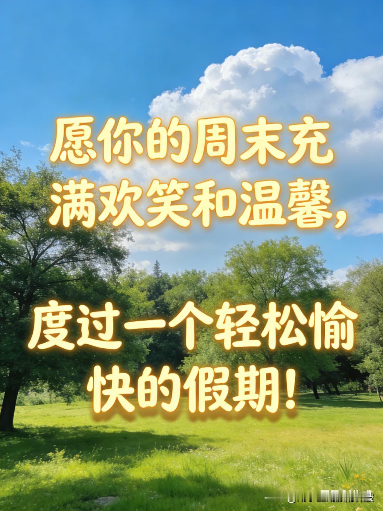 周末愉快祝福词来啦!供友友们参考: 祝你周末愉快,放松心情,享受每一刻的美好! 愿你的周末充满欢笑和温馨,度过一个轻松愉快的假期! 祝你周末平安顺遂,心情舒畅,快乐每一天! 愿这个周末带给你无限的快乐和美好的回忆! 祝你周末好心情,休息充电,迎接新的一周! 愿你的周末像阳光一样温暖,像微风一样轻松! 祝你度过一个充满爱与幸福的美好周末! 祝你周末愉快,心想事成,快乐无限!