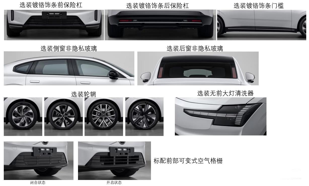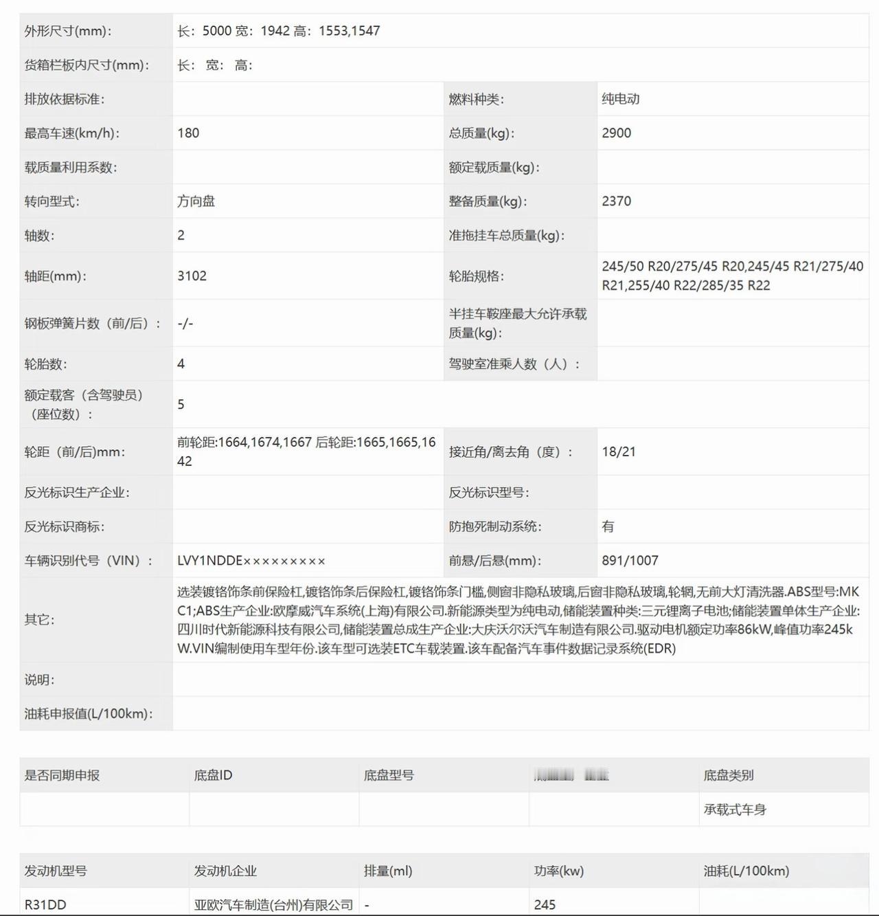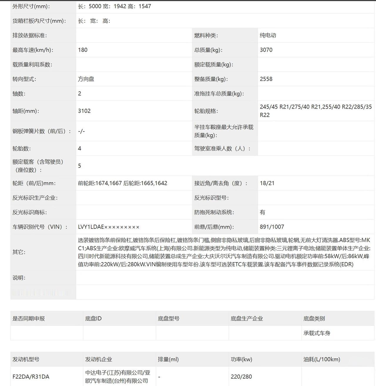 沃尔沃ES90申报图 三米轴距 掀背尾门+双电机 106度电池 沃尔沃ES90定位纯电中大型轿车,车身尺寸长5000mm、宽1942mm、高1547mm,轴距3102mm,前轮轮距1674mm,后轮轮距1665mm。 外观上,前脸封闭式格栅,中是立体斜向LOGO。大灯是进化版雷神之锤矩阵LED灯组,断点式灯带+下方分体灯组。 侧面,溜背造型,风阻系数0.25Cd,隐藏式门把手,可选21、22英寸空气动力学轮辋。 车尾,维京战斧分体式C型LED尾灯 灯带延到后风挡两侧,有动态迎宾效果。 掀背尾门,前后杠与侧裙可选镀铬饰条,车窗支持隐私和非隐私选装。 动力上,有双电机四驱和单电机后驱。 四驱版前电机功率220kW,后电机280kW,扭矩770牛·米,最高车速180km/h。 后驱版功率208kW,扭矩490牛·米。 800V平台,106度三元锂电池,CLTC续航740公里,支持350kW快充。10%-80%充电 20分钟,充电10分钟补能300公里。 底盘上,自适应双腔空气悬架,能实时调节阻尼,兼顾舒适和操控。 智能配置上,可选装激光雷达,配备1激光雷达、5毫米波雷达、7摄像头、12超声波传感器。算力508TOPS,支持高阶驾驶辅助功能。 最后,沃尔沃ES90主要优点在:800V平台+107度电池。 纯电架构空间大、轴距长,车身结构、电池防护和主动安全硬件堆料足,延续沃尔沃安全基因,被动安全和基础驾驶辅助成熟。 短板:外观缺少一些旗舰轿车的气场和辨识度。 车机和智能化交互偏传统,流畅度、功能生态跟新势力有差距,车身的整备质量偏高,电耗控制、底盘灵活度,操控响应可能受影响。 硬件达标,但设计、性能、科技缺少一些独特记忆点。