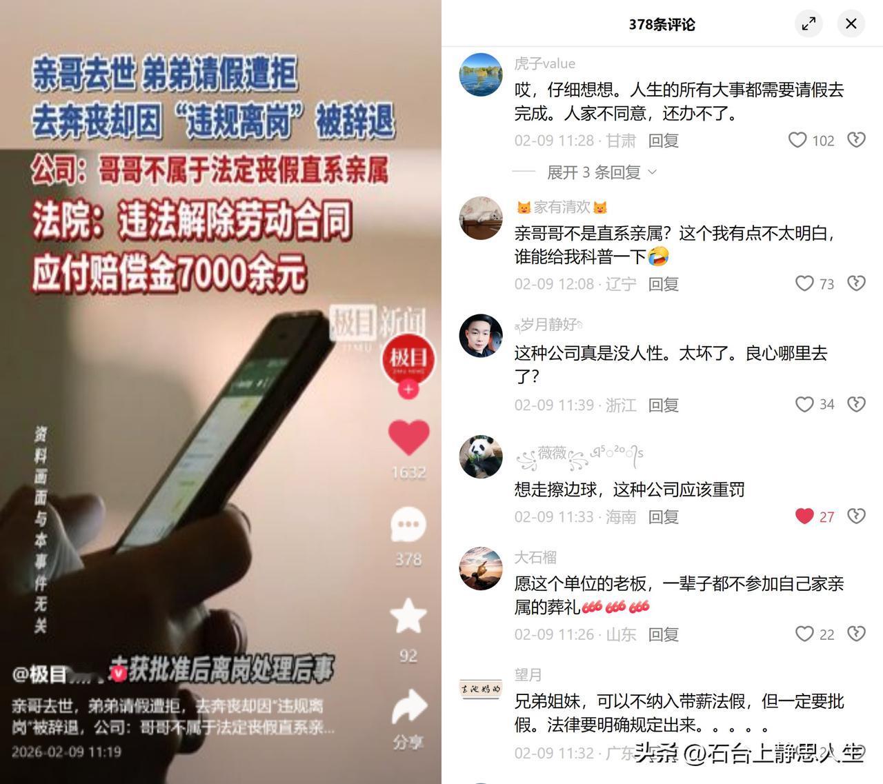 亲哥去世请假被拒,奔丧后遭辞退 厨师乔某亲哥病危,微信申请无薪事假没获批,哥哥去世当晚他紧急离岗奔丧,回来却被以违规离岗辞退。公司称兄弟不算法定丧假直系亲属,最终相关单位依公序良俗判公司违法,赔了7000余元。 这事儿看着扎心,实则击中了无数打工人的软肋,我们人生里的生老病死,居然都得先过公司的审批关。企业总拿规则当挡箭牌,法定外的人情需求,全成了违规的理由。可规则是服务人的,别拿来冻人心,亲哥离世的锥心之痛,难道还抵不上一次临时排班? 有人说人生大事都要请假才能办,这话太让人破防。我们天天为公司拼,可在某些眼里,我们的个人悲欢,只是影响产能的意外变量。 好在相关单位给了公道,但现实中,多少人只能咬碎牙咽肚子里?你遇过这种规则压过人情的糟心事吗?
