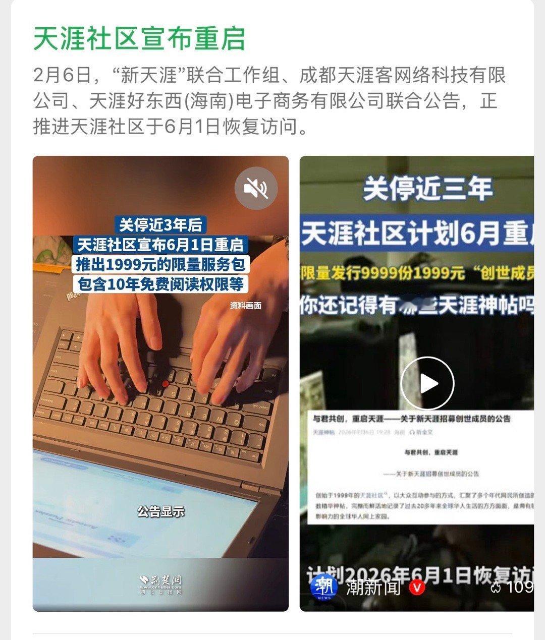 天涯论坛宣布重启,还推出了一个新天涯创世成员产品服务包,全球限量发行9999份,售价:1999元/份