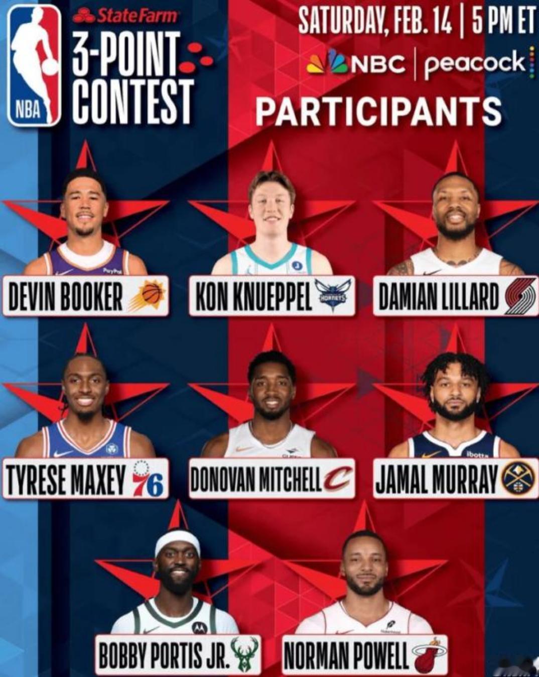 北京时间2月9日,NBA官方宣布了全明星三分大赛参赛名单,可谓是星味十足。卫冕冠军德文·布克在列,同时两届冠军达米安·利拉德也将参赛,若成功夺冠,他将追平赛事历史三冠纪录。此外,马克西、多诺万·米切尔、贾马尔·穆雷、波蒂斯和诺曼·鲍威尔同样入选。