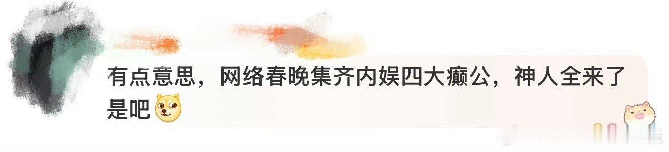 网络春晚集齐内娱四大癫公 救命!这四人同框就是喜剧名场面预定。武艺丁真老友相见疯狂整活,沙一汀井胧人前帅气人后抽象。小年夜20点开播,准备好迎接这场爆笑团建!