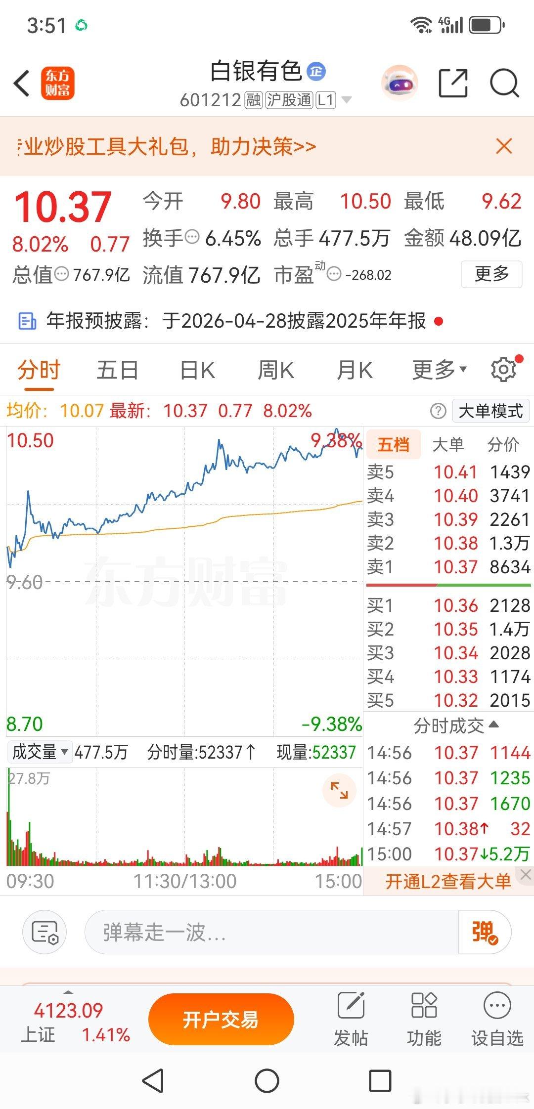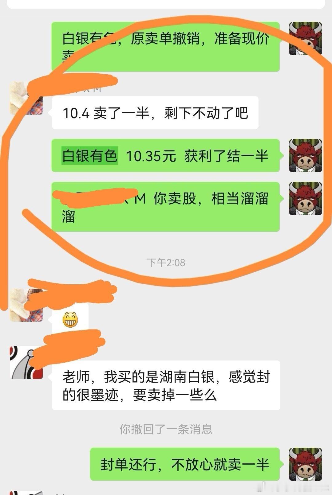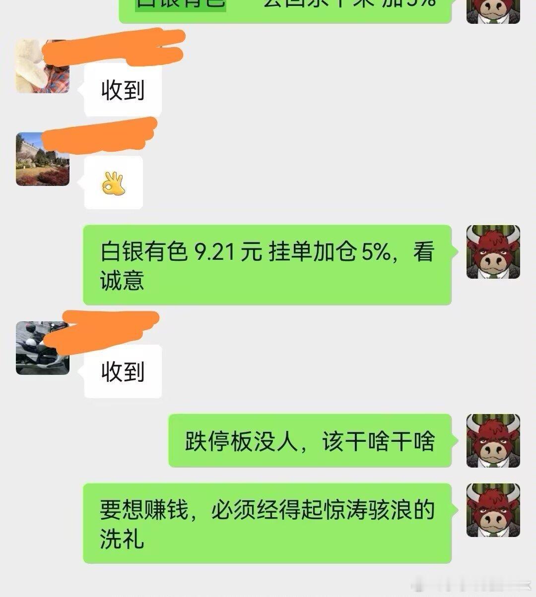 白银有色,哭爹喊娘的时候永远是买点白银有色,有人问我今天为何要卖,我的回答是为何不卖?这就是人性的贪婪。上周四我跌停买入,上周五又给我了一个跌停,抱歉我没有被吓到,你敢跌我是绝对敢买的。我可以大胆的说,周五的白银的大跌,绝对击溃了大多数人的心理防线。今天白银有色的大涨是预料之中的,这就是我说的节前双红包,前一个是晓程科技,后一个是白银有色。今天在上涨到8个多点10.35元的时候,我减仓了一半,原因1、白银有色今天的上涨落后于湖南有色2、白银有色今天的上涨已经来到了5日线的压力位,不知道是否还能往上冲击。3、年前我想把红包带回家,利润看的淡一些希望,明天再接再励,不过我也是一颗红心、二种准备的。欢迎加入我们的免费交流群财经股票
