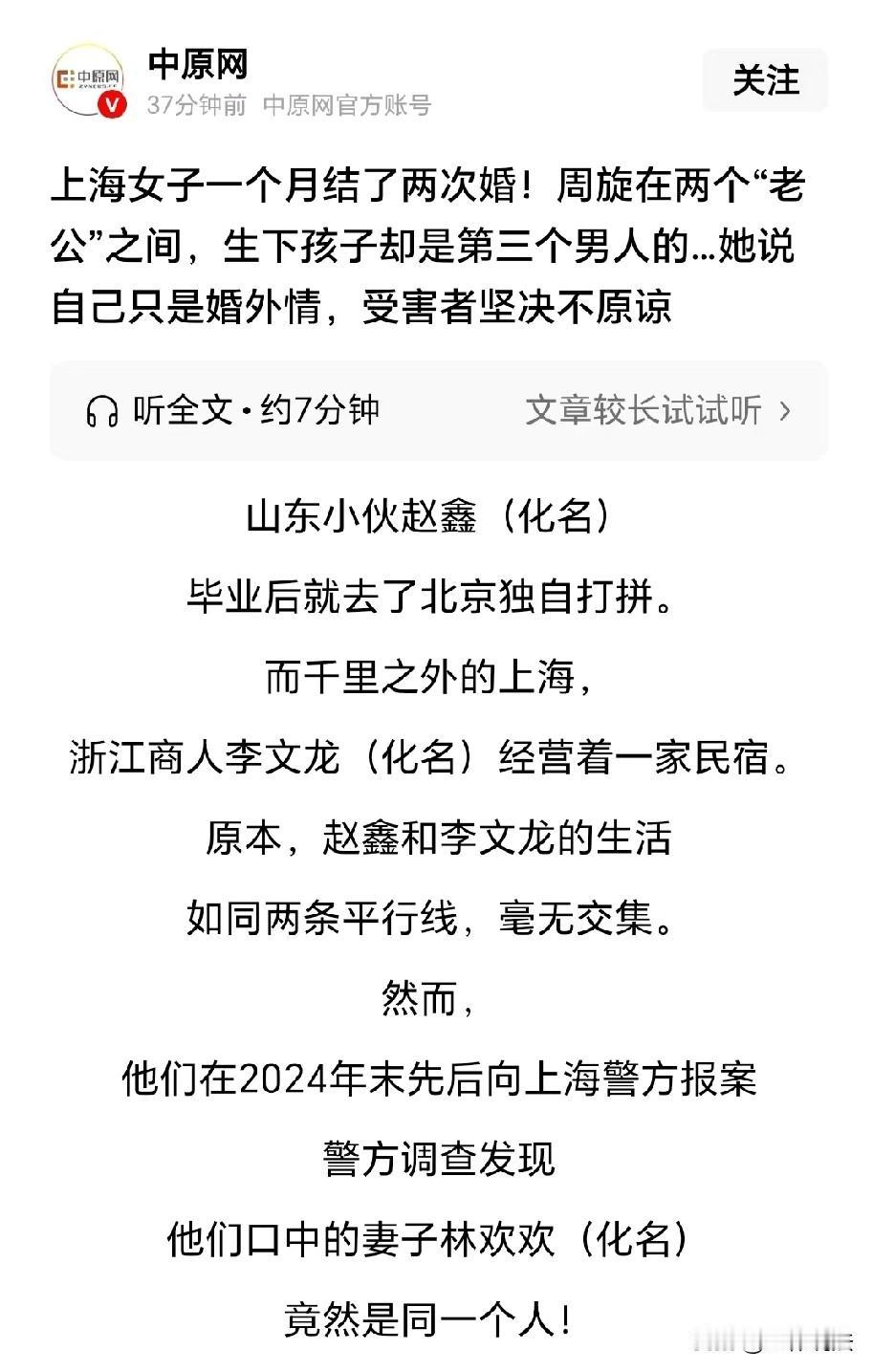 比电视剧都疯狂!上海,女子在父母催促下,随便找了个男子领证结婚,两人还约定互不干涉。婚后,女子为了追求所谓的爱情,通过网络先后认识了另外两个男子,并在一个月的时间里,分别和两个男子结婚,并以孩子为借口,向两个男子索取财物。常在河边走,哪有不湿鞋,两个男子慢慢察觉到不对劲,先后报警求助,民警调查才发现,这个孩子竟然是第三个男子的。 2017年,上海的林女士被父母催婚催得焦头烂额,实在不想再被念叨,她在网上随便找了个同样被催婚的男子程某。 两人一拍即合,商量好只是领证应付父母,婚后互不干涉、各玩各的,就这样稀里糊涂领了结婚证。 一开始,林女士觉得这种“假婚姻”特别自由,没人管着,也不用承担家庭责任,心里还挺满意。 可时间一长,她又开始向往正常的恋爱和婚姻,觉得这样的生活太单调,于是又在网上开始寻找新的交往对象。 2021年,林女士在网上认识了在北漂的山东小伙赵某。 赵某被林女士吸引,两人很快确定关系,谈起了异地恋。 异地恋毕竟有很多不便,为了能和林女士在一起,赵某毅然辞去北京的工作,搬到上海生活。 赵某在嘉定区找了份工作,而林女士主要在浦东、奉贤、崇明一带活动,两人距离不算近,只能过着周末见面的“周末夫妻”生活。 对此,赵某心里虽然有点遗憾,但能陪在林女士身边,他已经很满足了。 没过多久,林女士告诉赵某自己怀孕了。这个消息让赵某又惊又喜,立刻把山东老家的父母接到上海,着急忙慌地把结婚提上日程。 双方父母见面后,对彼此都很满意,结婚事宜谈得十分顺利,两人还在山东老家热热闹闹办了婚礼。 婚礼结束后,赵某想着赶紧领证,不然孩子出生后上户口会很麻烦。 可林女士却找各种理由推脱,说她是失信人员,领证会影响赵某,还安慰他说单身女性也能开出生证明,不用着急。 赵某虽然心里有点疑惑,但还是相信了林女士的话,没再追问。 原本是一段幸福的婚姻,可林女士并不知足,就在和赵某谈婚论嫁的同时,2021年6月,林女士还在网上认识了在上海经营民宿的李先生。 李先生比林女士大十几岁,可两人特别投缘,聊起婚姻、家庭的想法都很一致,感情迅速升温。 为了让林女士过得更好,李先生还特意租了一套别墅,满心期待着和林女士组建家庭。 没多久,李先生的父母也从浙江赶来,和林女士的“父母”见面商量婚事。 其实林女士的父母根本不知道她在外面的这些事,这一切都是林女士花3000块钱雇了临时演员假扮自己的父母。 见面过程很顺利,李先生的父母还当场给了林女士8万8的彩礼,李先生看着这一切,觉得幸福就在眼前,对领证的事也没太着急,只觉得是早晚的事。 为了同时应付赵某和李先生,林女士也是煞费苦心,见两家人时雇的都是不同的演员,生怕被发现破绽。 而她和程某的合法婚姻,更是被她藏得严严实实,两个男人对此一无所知。 后来,赵某因为工作要长期出差,林女士觉得经济条件更好的李先生更适合自己,便主动和赵某提出了分手。 分手也就罢了,可她并没有就此放过赵某,转头就告诉赵某,她分手后生下了一个儿子,还时不时以孩子为借口向赵某索要财物。 赵某信以为真,心里满是愧疚,一次次给林欢欢转钱。 另一边,李先生和合伙人闹了矛盾,被迫回到浙江老家,和林女士开始两地分居。 为了稳住李先生,林女士还经常给他发孩子的视频,说孩子是他的。 可细心的李先生很快发现了不对劲,视频里逗孩子的男人声音,和他之前见过的“岳父”声音完全不一样,他开始怀疑林女士是不是背着她和其他男人交往。 而赵某这边,也慢慢察觉到了异常。 林女士说生的是儿子,可他见到孩子时却是个女儿,而且孩子的年龄也和他预想的对不上。 赵某一开始还自我安慰,觉得是孩子个头小、发育慢,可越想越觉得不对劲,心里的疑惑越来越深。 赵某和李先生先后察觉到异常,选择了报警求助。 民警介入调查后,真相终于水落石出:林女士生育的这个女儿是她和程某在2023年生下的,孩子的父亲既不是赵某也不是李先生。 她所谓的怀孕、生子,全都是编造的谎言,目的就是利用两个男人的愧疚心理索取财物。 得知真相的赵某彻底崩溃,林女士编造怀孕的谎言,让他经历了人生的至暗时刻,心力交瘁,实在无法原谅。 而林女士却不以为然,觉得自己的行为顶多算婚外情。 殊不知她隐瞒婚姻、虚构事实骗取财物,早已触碰了法律的红线,等待她的必将是法律的制裁。