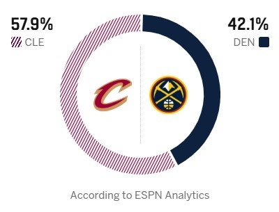 ESPN预测明日胜率:骑士57.9% 掘金42.1%