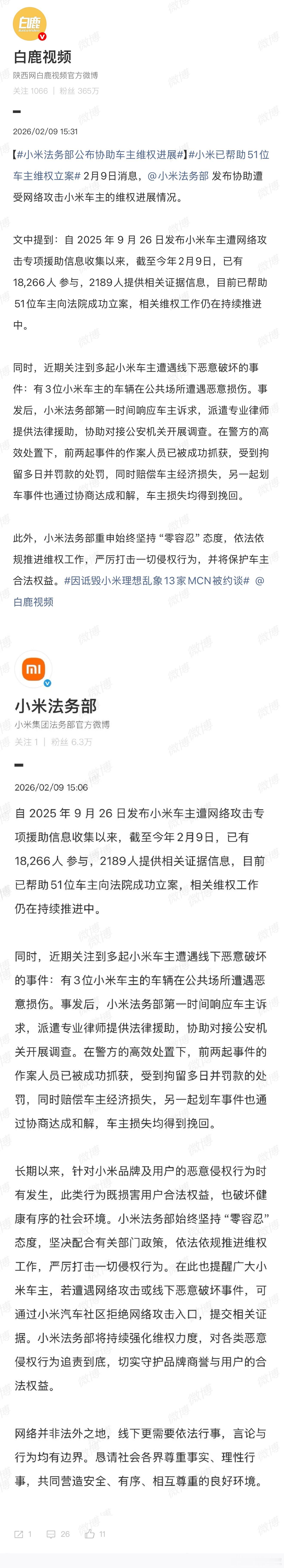 小米法务部公布协助车主维权进展仔细看了整个事情的经过,嫌疑人已经受到惩罚,车主损失也全部得到挽回,事情结果还是可以的。所以网络真的不是法外之地,线下更无侥幸可言,任何违法行为,终究要付出应有的代价。这也给所有车主提了个醒,遭遇车辆恶意破坏时,不要慌乱不要着急,按照步骤维权就可以了。例如第一时间报警,同步固定现场证据,多角度拍摄车辆受损情况、调取周边监控,留存关键线索,然后及时联系相关品牌法务,借助他们的专业来高效维权,最大程度保护自身权益。汽车圈“饭圈化”乱象愈演愈烈,部分极端粉丝盲目维护品牌,动辄对其他品牌车主进行恶意攻击、破坏车辆,以为是“替品牌出头”,实则是触犯法律的行为。结果所有后果还是自己承担承担,搬起石头打自己的脚,得不偿失。还是那句话摒弃饭圈思维,理性看待品牌与竞争,才能让汽车行业回归到良性发展的道路上来。