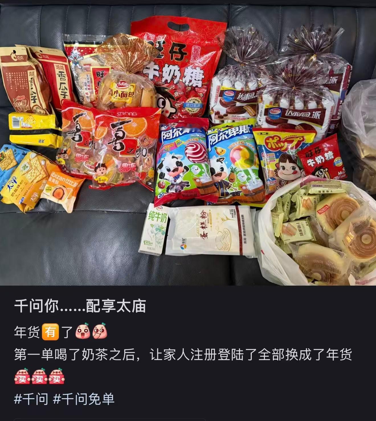 原来千问这波是个连续剧,之前是买奶茶、生鲜、现在开始买年货了,刚才朋友聊天说这事,她说千问刚发了一份《免单卡最火年货清单》让我去抄作业。
