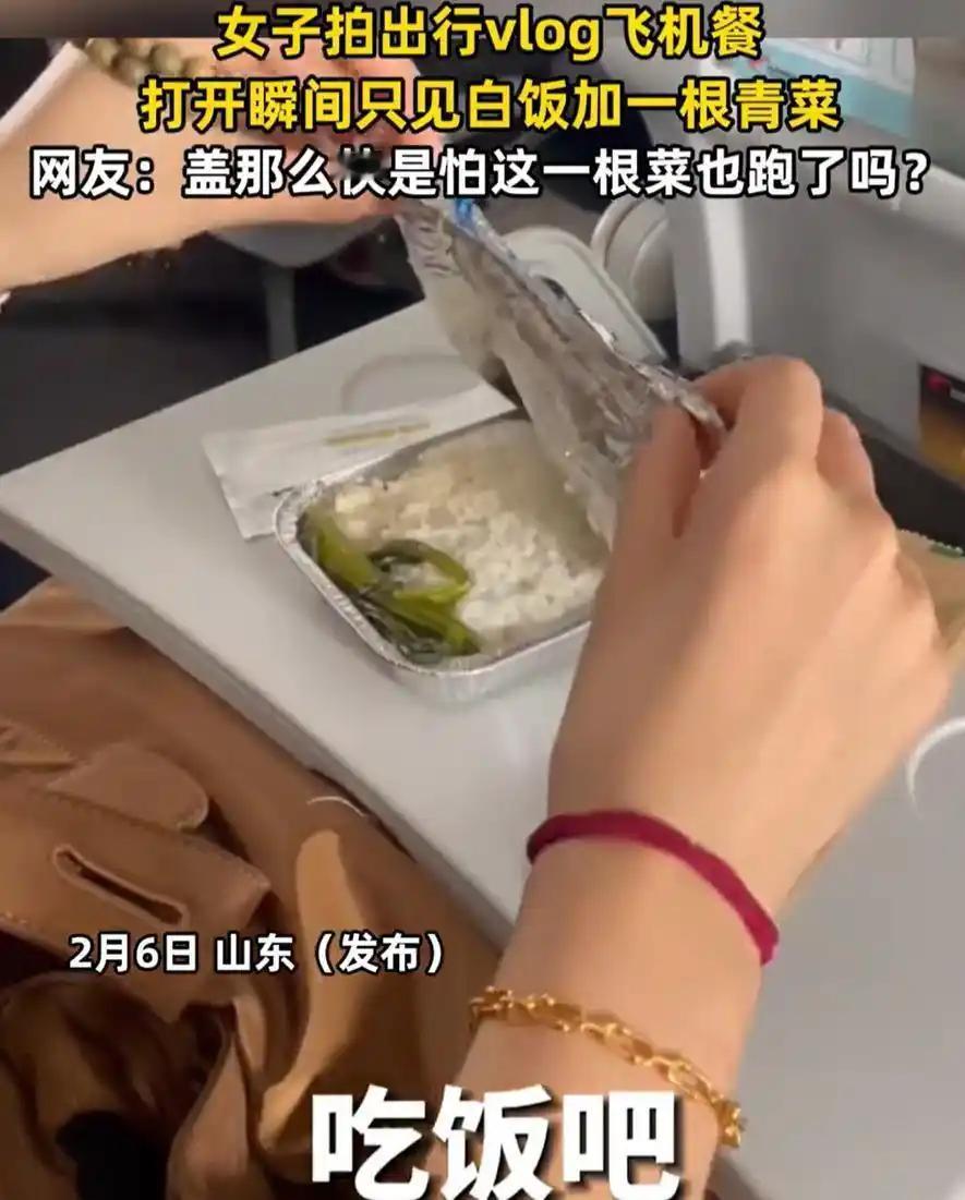 伤害性不高侮辱性极强!2月6日,山东一女子坐飞机出行,飞机起飞不久空姐就端上来飞机餐,万万没想到,女子把盖子打开一看,里面就只有一碗饭加一根青菜,吓得女子连忙盖上了盖子。网友:盖那么快是怕这一根菜也跑了吗? 山东一位女士乘飞机出行,航班平稳起飞没多久,空乘就推着餐车送来了飞机餐,温热的餐盒递到手上时,她还满心期待地架着手机拍vlog,想记录下旅途里的这一小段日常。   可掀开餐盒盖的那一刻,所有期待都烟消云散,甚至让她下意识做出了一个光速合盖的动作。   任谁也想不到,打开的餐盒里,大半个空间都是质地偏硬的白米饭,米饭上孤零零躺着的,只有一根手指长的青菜,没有肉、没有酱汁,连第二根青菜都没有,那抹突兀的绿,在满盒白米饭的衬托下,显得格外寒酸。   这一幕不仅让当事人愣住,后续视频发到网上,也让网友们纷纷调侃,有人打趣她盖盖子的速度太快,怕是怕这根独苗青菜趁机跑了,还有人给这份飞机餐起了个禅意的名字,叫“空中辟谷套餐”,调侃这餐食连油星都见不到,怕是减肥人士看了都要直呼业界良心。   这场全网热议的飞机餐风波,后续还有个小反转,当事人出面解释,说这款餐盒是双头设计,她当时只掀开了主食那一侧,另一侧其实还有少量配菜,并非真的只有白米饭配一根青菜。   可这个解释,更像是给这场尴尬加了个补丁,即便另一侧有配菜,也改变不了那根青菜带来的视觉冲击,更消解不了网友们的共情。   说到底,大家之所以对着这个视频津津乐道,并非真的纠结餐盒的设计,而是这份飞机餐带来的“寒酸感”,精准戳中了很多人对当下航空服务的感受,这份误会里的画面,反而比真相更贴合大众的体验。   要知道前些年,全服务航司的飞机餐远不是这般光景,热腾腾的面包、切好的水果、独立包装的零食是标配,主菜甚至还能在鸡肉和鱼肉之间做选择,可如今的飞机餐,却精简到了让人觉得离谱的地步。   有人说这是伤害性不高,侮辱性极强,这话一点不假。没有谁会真的指望飞机餐能山珍海味,但一碗白米饭配一根青菜,未免显得太过敷衍,这种极致的精简,不是简单的“极简”,而是让乘客感受到了不被重视。   而这根孤零零的青菜,其实也是航空行业现状的一个缩影,机票价格在各大平台的竞争中一降再降,航司的利润空间被不断压缩,为了控制成本,免费行李额缩水、座椅间距变小,就连飞机餐,也成了被精简的对象,不少全服务航司,都在被迫向廉航的标准看齐。   航司有航司的委屈,众口难调不说,低价票的前提下,想要兼顾餐食品质本就不易,配多了容易造成浪费,配少了又会被吐槽。   可乘客也有乘客的感受,花了钱出行,即便票价不高,也不想收到这样一份显得敷衍的餐食,那声光速合盖的“啪”声,是失望,更是对这种消费降级的本能反应。   可现实的无奈也在于此,即便吐槽这份寒酸的飞机餐,即便觉得这份服务少了些体面,当看到低价机票时,很多人还是会选择坐上那趟航班,接过那个轻飘飘的餐盒。   这根躺在米饭上的青菜,成了航空行业成本与服务博弈的缩影,也成了普通消费者在价格与体验之间权衡的真实写照。