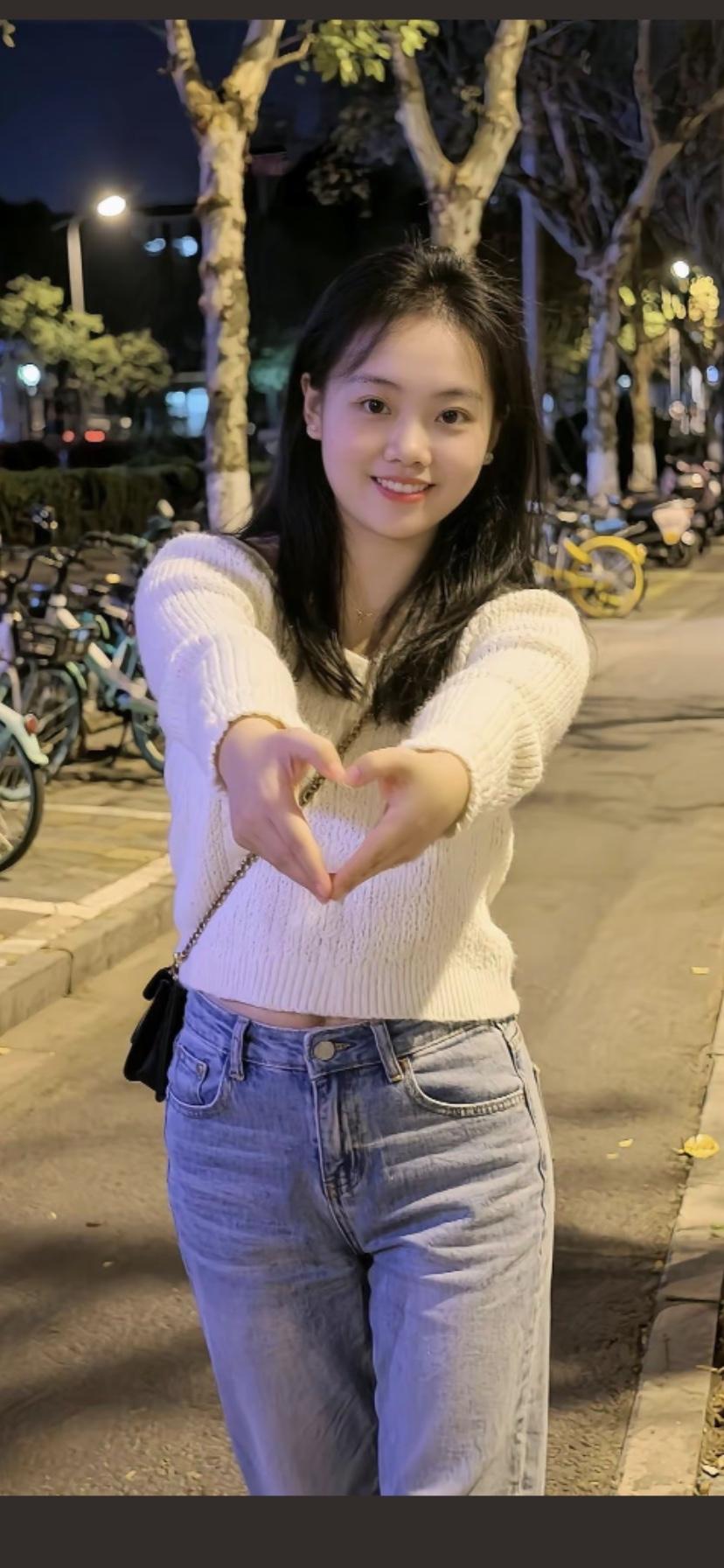 夜晚街头的甜美自拍,白色毛衣搭配牛仔裤,心形的微笑😊