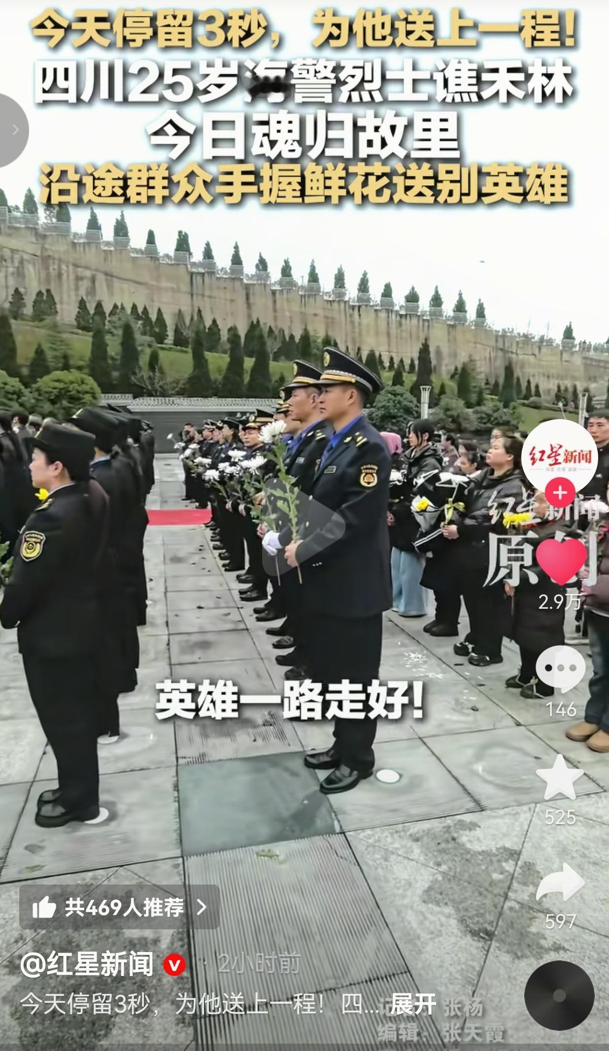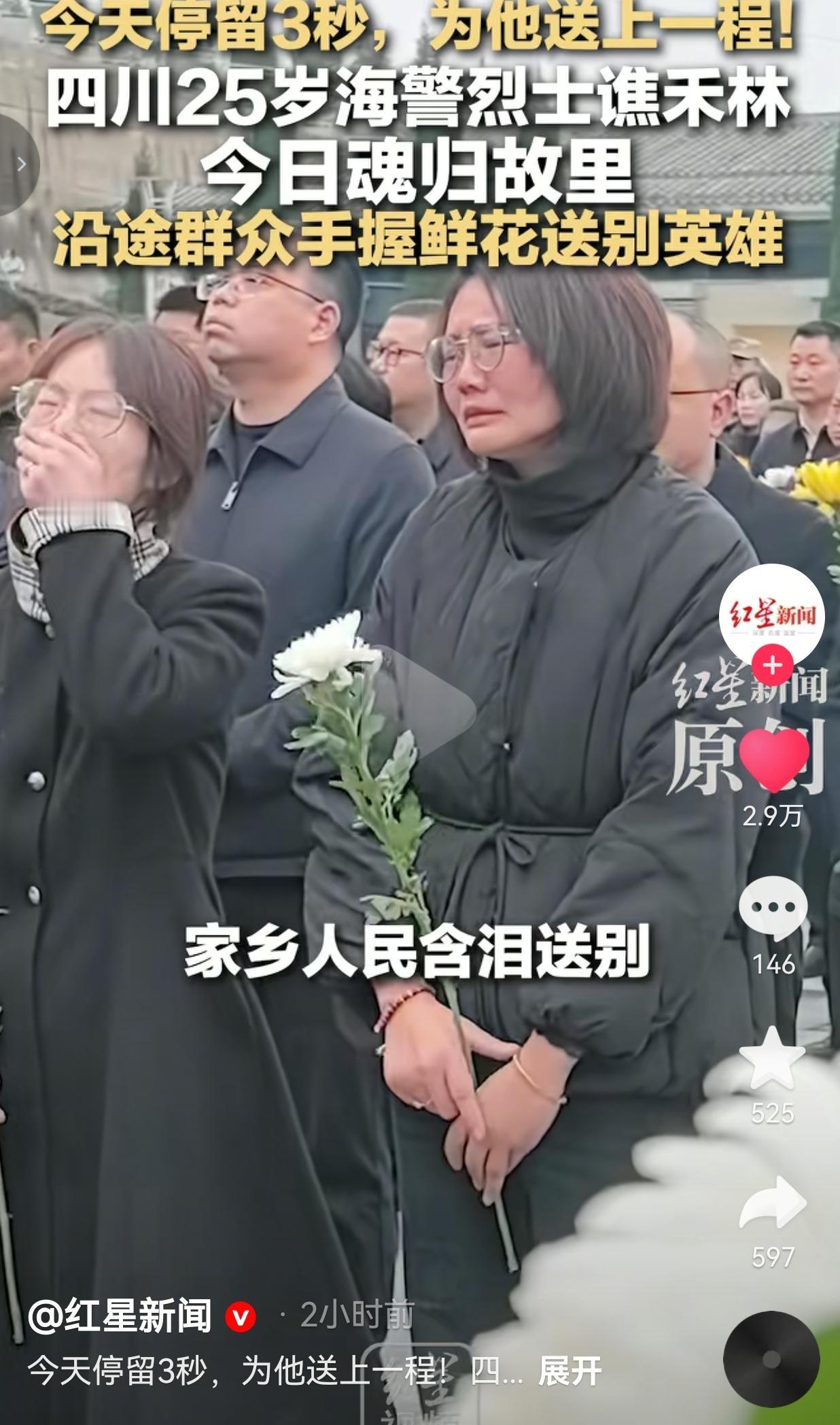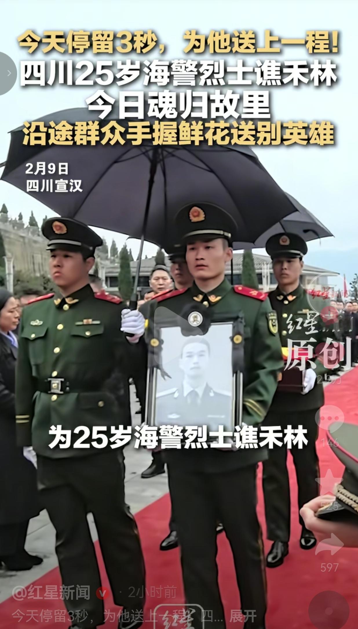 今天刷到谯禾林烈士魂归故里的视频,我看了很久,眼泪就这么不自觉地掉下来了。一方面对他的敬佩,另一方面是对他失去生命的惋惜。 2月9日,四川宣汉,天是阴沉沉的,天气也比往常寒冷,可这一天,天生镇的街道上已经站满了人民群众。 大家眼含热泪,表情庄重,手里攥着白菊和黄菊,从家门口一直排到了宣汉烈士陵园的路上,就为了欢迎这个25岁的英雄回家。 护灵车队在摩托车的引导下缓缓驶来,当战士们捧着谯禾林的遗像,一步步踏上红毯时,我看到人群里他的妈妈已经哭成了泪人,手里紧紧攥着一枝白菊,肩膀都在发抖。 还有那些自发来送别的乡亲,脸上全是止不住的心疼,有人悄悄抹泪,有人红着眼眶默念“英雄一路走好”。 谁能想到,这个从大山里走出去的年轻人,生命永远定格在了2025年12月9日。 那天,他在查证走私嫌疑船只时遭遇暴力抗法,被恶意冲撞的走私艇击中落水,为了守护国门和同胞的安宁,再也没能回来。就这样,一个年轻的生命就活生生地逝去了。 此视频传到了网上,引发无数网友的共鸣和悼念,有的网友说:“英雄永垂不朽,这才是我们该追的星!” 也有的网友说:“25岁啊,正是最好的年纪,太心疼了!父母的心有多难受啊!” 还有的网友说:“山河无恙,只因有人替我们负重前行,这个四川的娃是真正的大英雄。” 我在想,25岁是什么年纪?是刚离开校园、对未来满怀憧憬的年纪,是还能跟爸妈撒娇、和朋友撸串的年纪。可谯禾林却把最鲜活的生命,献给了他穿在身上的那身警服。 我们总说“岁月静好,其实,哪有什么岁月静好,只不过是有人替你负重前行罢了”。以前觉得是句口号,今天看着这满街含泪的人群,看着护灵车缓缓驶向陵园,看着墓碑前铺满的鲜花,才真正懂了这句话的分量。 他不是天生的英雄,只是一个普通人选择了挺身而出。当危险来临的时候,他没有退缩,用自己的血肉之躯,为祖国奉献。 英雄回家了,可他的英雄事迹我们不该被忘记。我们要知道,今天能过上安稳地生活,能安心地过年,就是因为有无数个像谯禾林这样的人,在我们看不见的地方,用生命守护着万家灯火。 最后,希望英雄一路走好!
