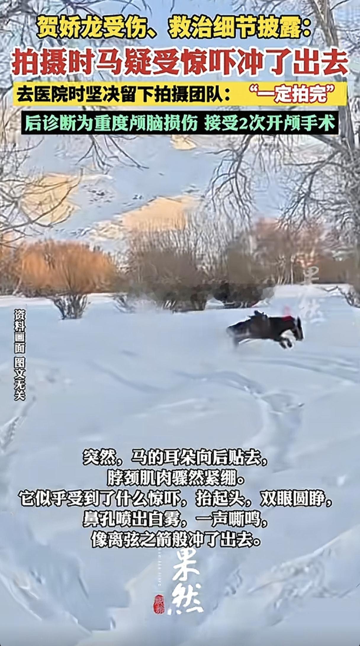 最后一通电话让人泪目!据报道,贺娇龙摔地后,两位牧民最先看到了她,当时的她自己坐了起来,意识清醒,只是说头有点疼。 1月11日下午3点,贺娇龙像往常一样在拍着宣传视频,她穿着最爱的红色:深红色马甲,搭配同色系马面裙。 突然,马的耳朵向后贴去,似乎受到了什么惊吓,飞快的冲了出去,很快就消失在众人的视野当中。 后来大家通过无人机设备,看到此时的贺娇龙试图控制身下的马,但瘦弱的她已经没了力气,在马背上的起伏越来越大。 马一个转弯,贺娇龙便被重重的摔在了地上,大家都朝着她坠马的地方奔去。 她被扶上车后,坚决要求大家留下,把剩下的拍完,出发前,她又摇下车窗,重复指令:“一定拍完。” 就在车子离开十几分钟后,她又打来电话,此时的声音已经变得虚弱:“不要耽误团队进程,策划的一定全部拍完。”她一再嘱咐大家,通话只有30秒。 这是她打出的最后一个电话。 40分钟后,贺娇龙被送到医院,头疼加剧,呕吐了两口,被推进急救室抢救,从此,她再也没有醒来…… 13日,已经开颅2次的她被紧急转院,14日清晨,贺娇龙的家人与医护人员作出一个艰难的决定——趁着她还在,送她回昭苏,让年迈的老母亲见上最后一面…… 当晚11时12分,在家人的陪伴下,贺娇龙安静地离开了。 她在生命的最后一刻还在想着工作, 那时的贺娇龙,估计自己都没意识到是什么样的后果在等着她。 地上有这么厚的积雪,怎么会伤的这么重呢?专业马术运动员都戴头盔,拍摄为什么不戴呢?安全措施做的确实不到位。 贺娇龙为了工作,真是付出了所有,了解的越多,就越喜欢她、越崇敬她、越心痛她!