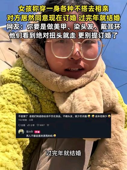 能看出这位博主的不敢置信! 她说有些男的是不是真的饿了,她穿的这么恶心去相亲,那些男的竟然同意了。 还说现在就订婚,过年以后就结婚。 然后就有人说,不是饿了,是因为博主这样的,一看就不做美甲,少买化妆品个衣服,是经济适用型的。 看到这个博主的吐槽,我就想起村里前几年,有个大龄叔叔娶了一个脑子有点问题的女的。 当时就有长辈说了,女人只要想嫁人,不管什么样的,都嫁得出去。 隔了两年,附近有个村子,有个从监狱刑满释放的女子,她还没回到家呢,就有很多人跑去她家提亲了。