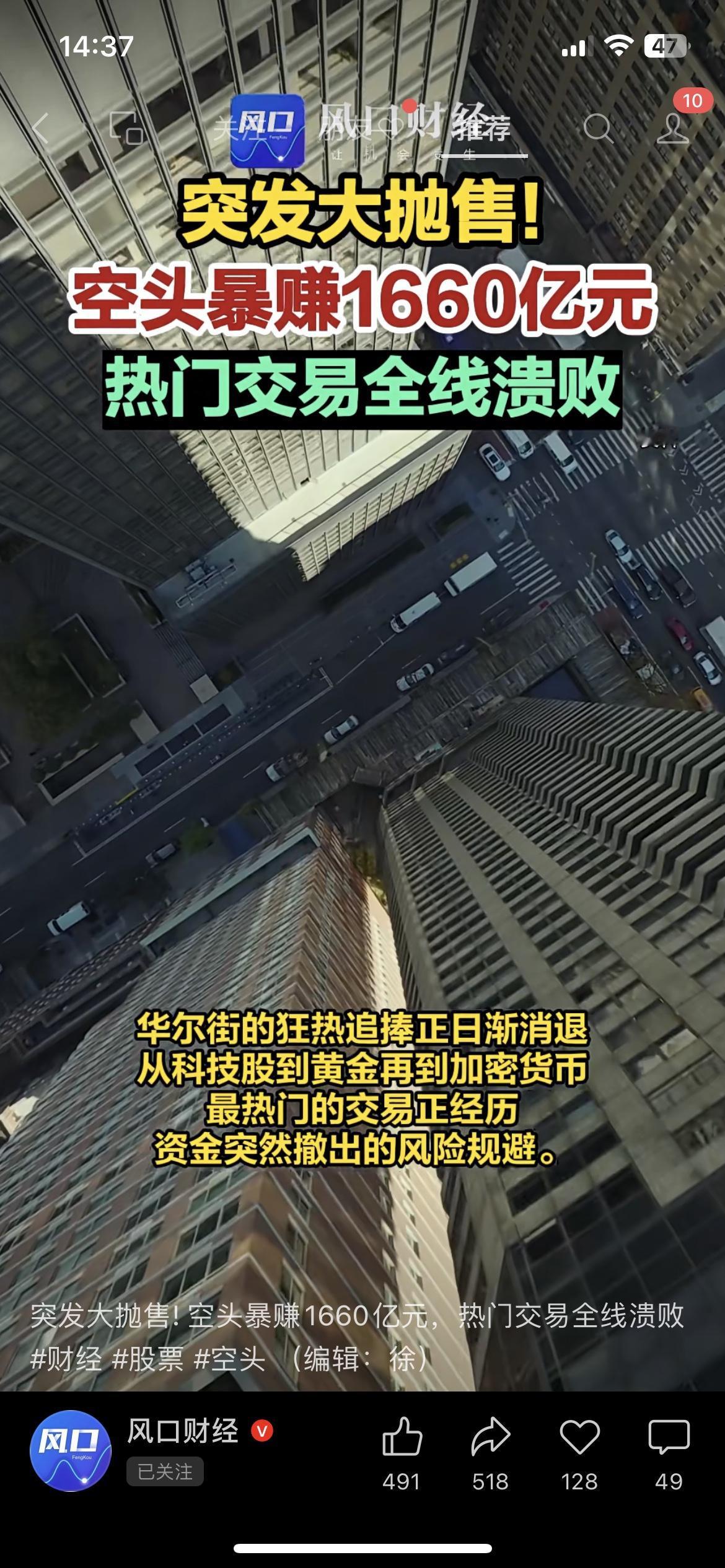 💸空头狂赚**1660亿**!科技股大抛售,咱们的ETF慌不慌? 我做美股的发小阿凯说,这波做空赚的钱,比他去年一年工资还多!华尔街狂欢的背后,是科技股基民的眼泪。 别人恐慌时你贪婪,但前提是你拿得住,不是追涨杀跌当韭菜! 咱们买的科技ETF,只要跟踪宽基指数(比如纳斯达克100)、规模10亿以上、跟踪误差小于0.1%,就别被短期波动吓破胆! 你会趁科技股跌了加仓,还是先观望等信号? 科技股 空头暴赚 ETF投资 财经热点 市场有风险,投资需谨慎