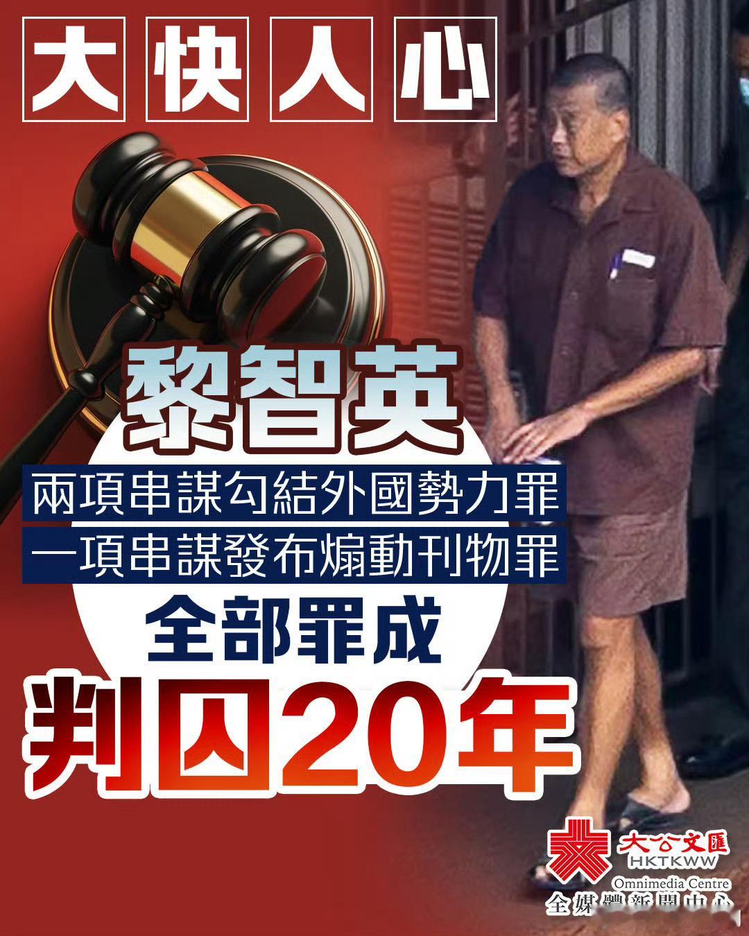 好消息!黎智英因串谋勾结外国势力等罪被判监禁20年。