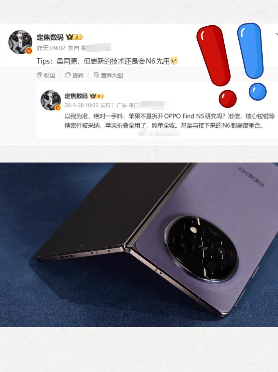 苹果折叠屏跟国产比有胜算? - 一觉醒来,科技圈要变天?苹果和国产的折叠屏,看来今年要彻底杠上了! - 先看苹果这边,憋了多年的大招——折叠屏iPhone(或叫iPhone Fold)终于有消息了。多方爆料都指向它可能在今年登场,目标直指“无折痕”内屏和屏下摄像头。有意思的是,为了攻克折痕难题,有消息称苹果甚至拆解了OPPO Find N5进行研究,甚至核心铰链几乎都全盘照搬了。 - 不过,也难怪苹果要“偷师”,最近有大V给OPPO Find N5做了个硬核测试:在极限雪地里暴力弯折5000次,结果展开后折痕依然很浅。另外,最近很多爆料都在说新一代OPPO Find N6也快来了,据说这次首发量产浅折痕技术,可能是由传说中的黑绷带玻璃+液态金属铰链组成,而且这个技术优势至少要独占半年。而且周意保也说了,行业避而不折的折叠屏难题,OPPO准备提前交卷了,这说的应该就是折痕吧? - 同时还会搭载骁龙8gen5、6000mAh大电池、2亿像素镜头,以及适配AI手写笔等等,产品力几乎顶满了,今年折叠屏市场真的有好戏看了。 - OPPO趁现在苹果折叠屏 OPPOFindN6 数码爆料 iPhoneFold 国产手机 科技趣闻