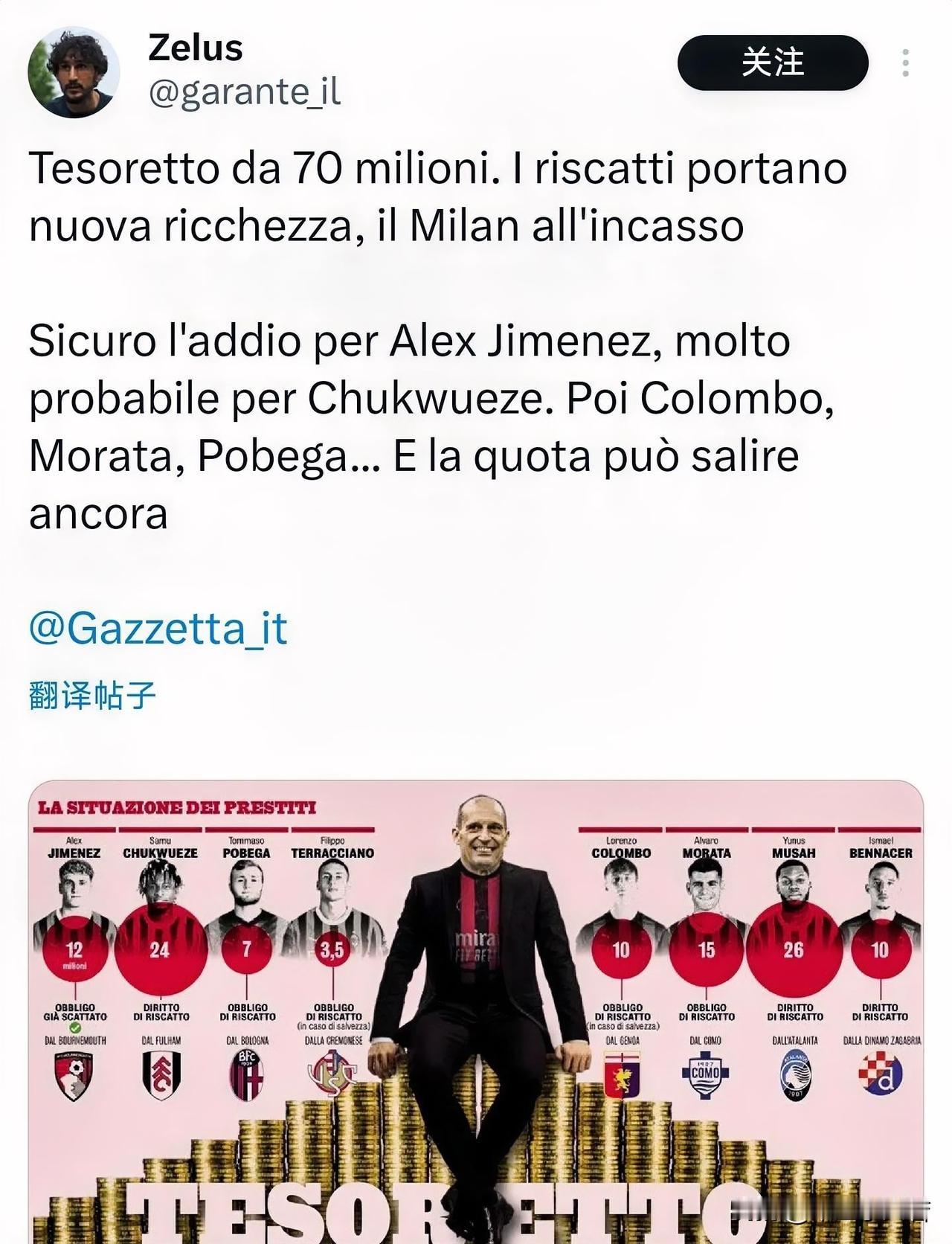 米兰外租球员会为米兰带来超过七千万的收入。现在情况是小希门尼斯与波贝加都已经买断,丘库埃泽莫拉塔只是时间问题,只要不出现大问题,赛季结束应该会完成买断,丘库埃泽前几天还说会提前买断,所以这两位只是时间问题。 穆萨与本纳赛尔现在并不确定,本纳赛尔在克罗地亚至少能有比赛,穆萨在亚特兰大是替补,说替补都有点婉约了,穆萨在亚特兰大根本就没啥上场机会。所以个人觉得哪怕本纳赛尔最后没有被博班买断,也不愁买家,穆萨真的难说了,冬季窗口就有消息说亚特兰大想退货,估计赛季结束会回到球队。 还有就是咱们的年轻前锋科隆博,科隆博合同是直接买断,所以他不在这个外租球员行列,其实莫拉塔也不应该属于这个行列。总之这些人会为米兰带来超过七千万欧元,如果本赛季米兰能回归欧战,咱们夏季窗口是可以期待的。