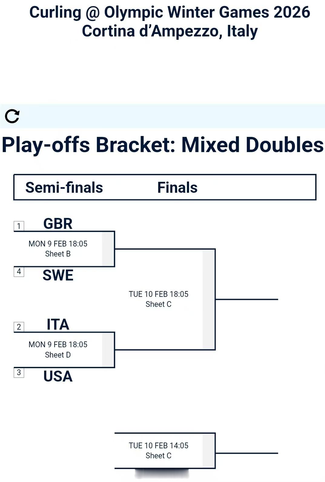 混双半决赛对阵🇬🇧英国 vs 🇸🇪瑞典🇮🇹意大利 vs 🇺🇸美国明天凌晨1点05进行两场半决赛