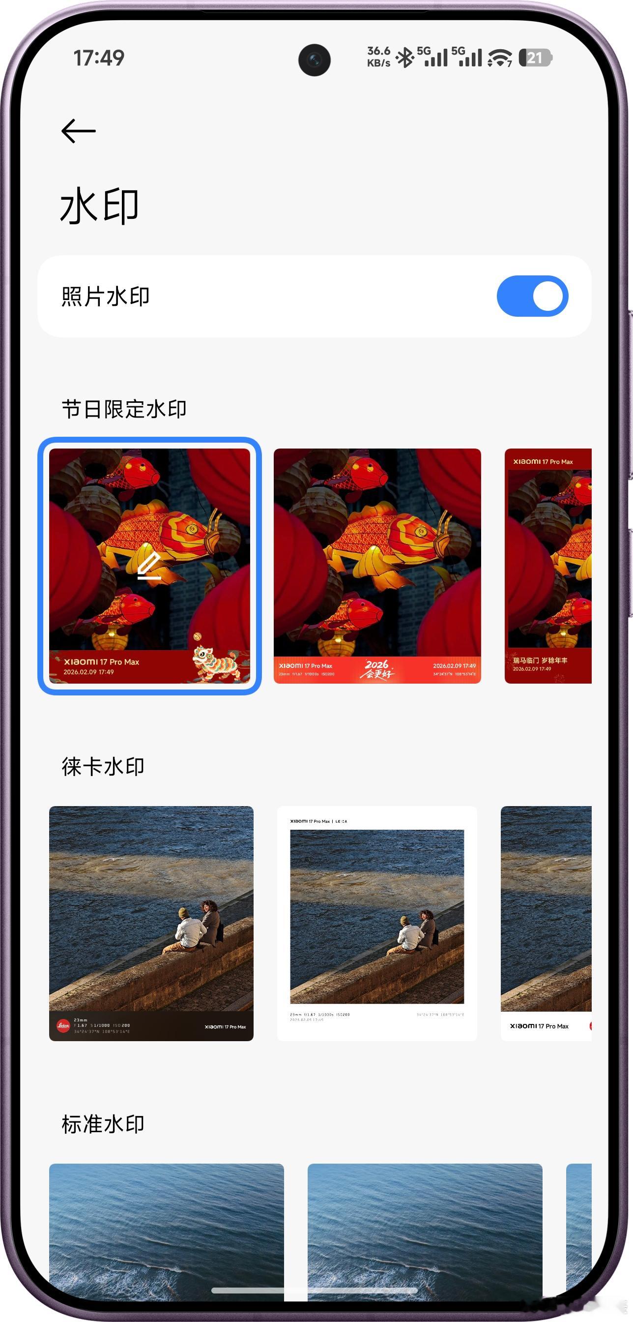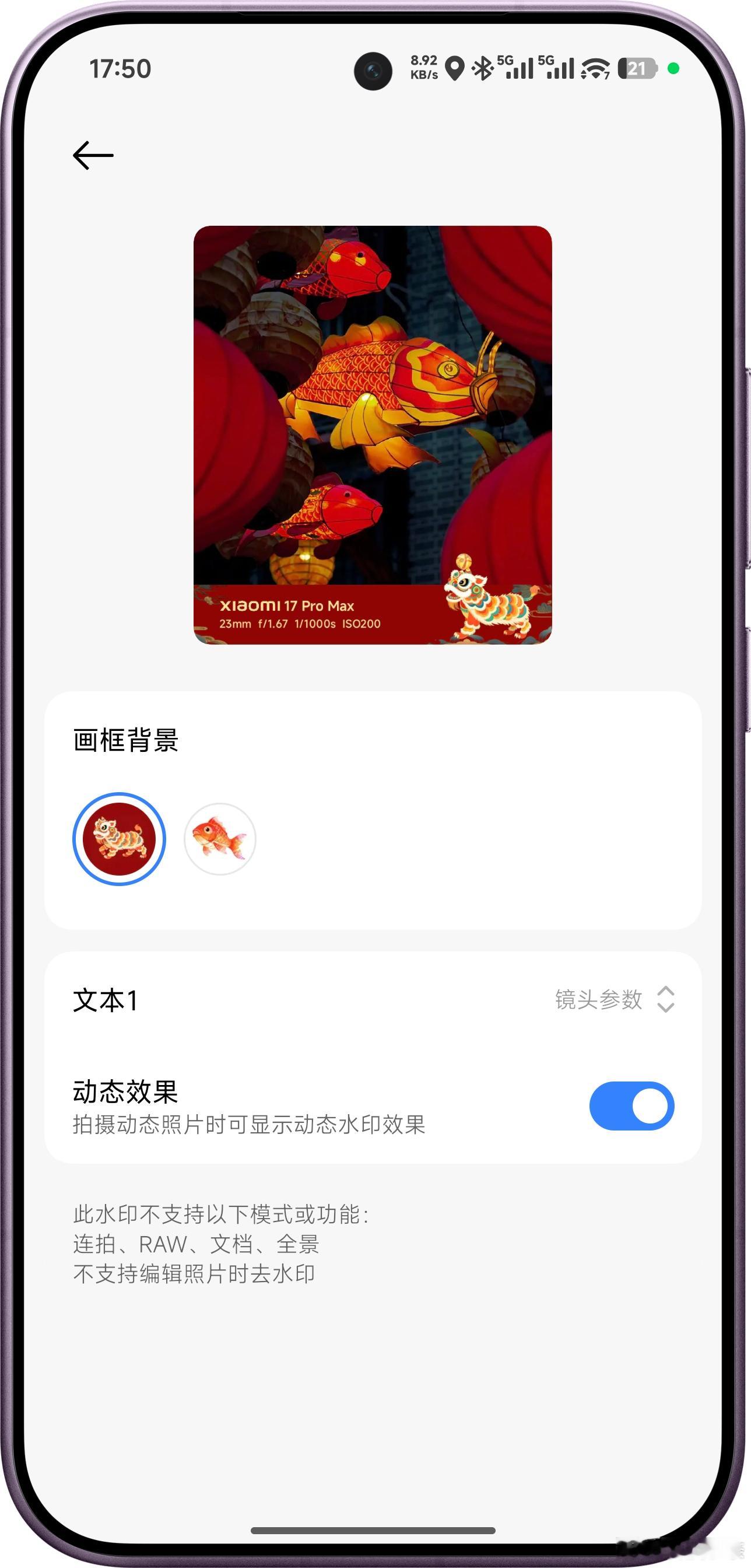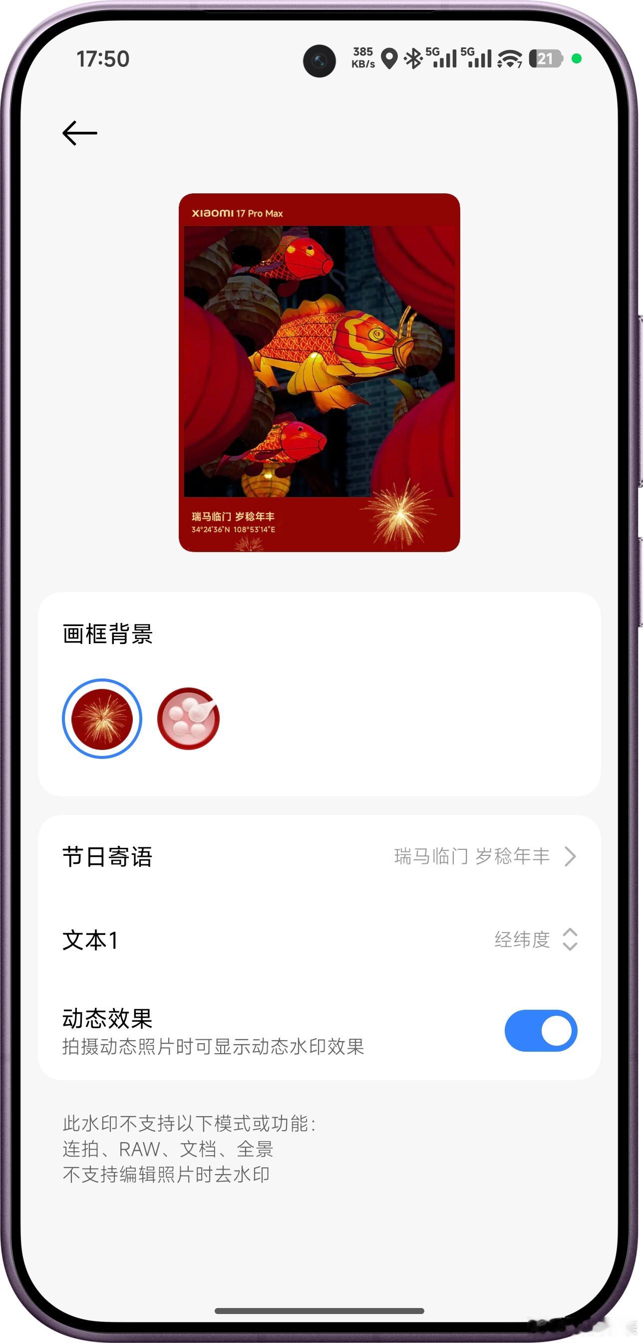 小米春节限定水印上线,这次不光款式挺多,每款里面也都还可以再调,然后在相册编辑里还多了个新春特效,用我自己的照片生成了一个,挺好玩~