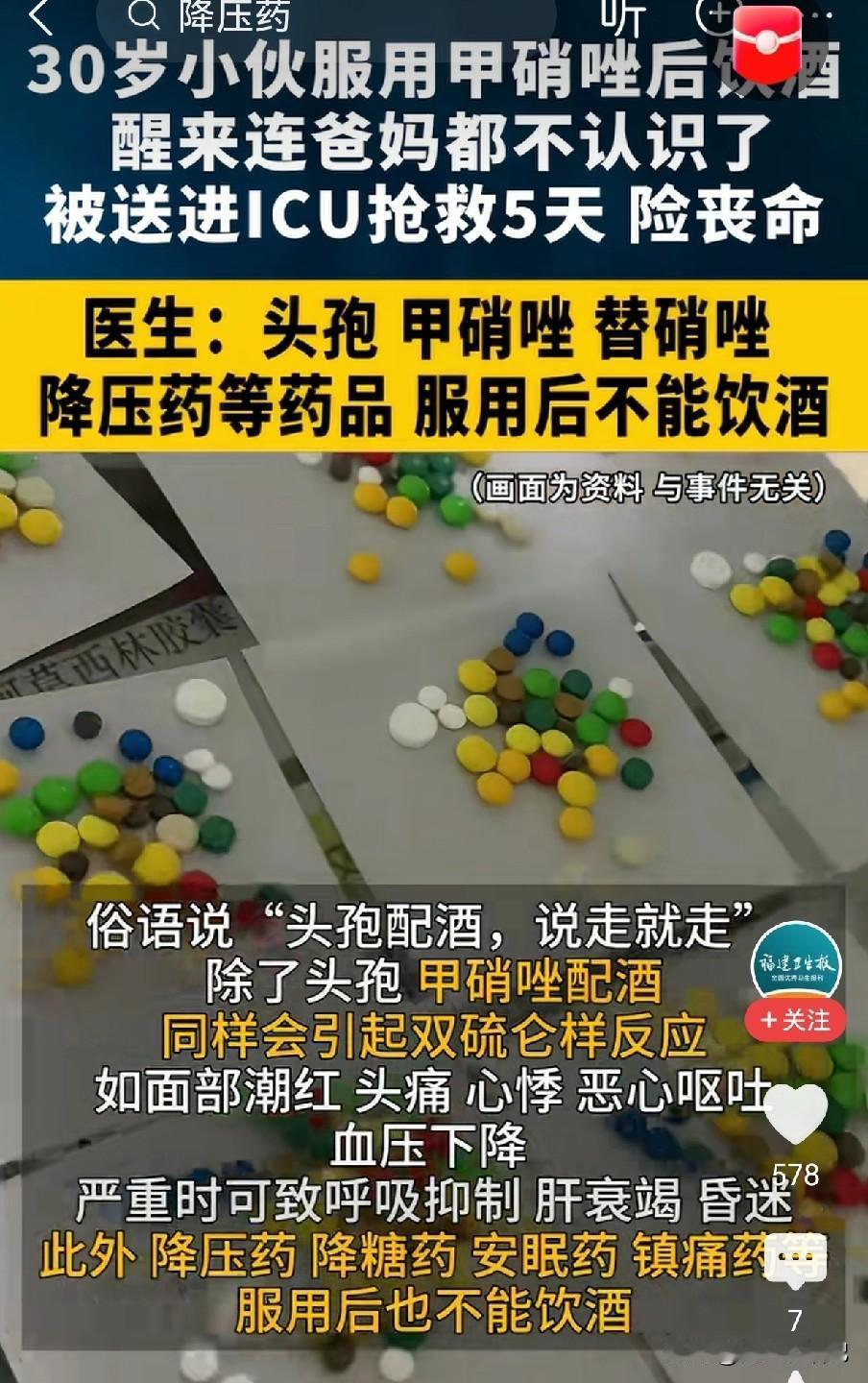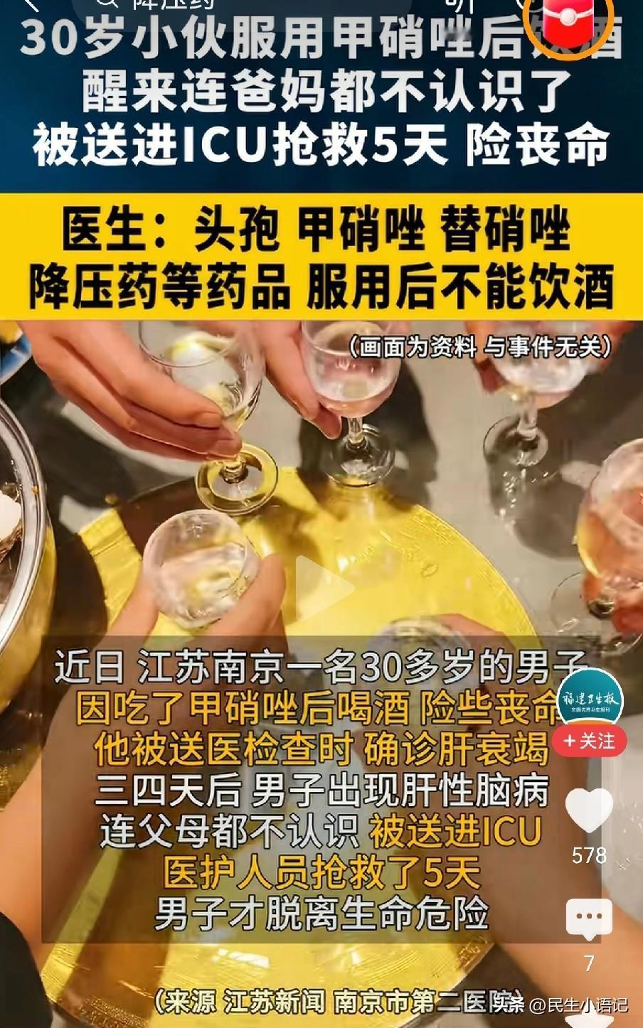 年关将至,亲友相聚推杯换盏成了常态,但千万别忘了:吃药期间,滴酒莫沾! 近日江苏南京一名30多岁男子,只因服用甲硝唑后饮酒,直接被送进ICU抢救,险些丢了性命,这起案例再次给所有人敲响了警钟。 想必大家都听过“头孢配酒,说走就走”,但危险的远不止头孢类药物。甲硝唑、替硝唑这类抗厌氧菌药,降压药、安眠药、镇痛药,还有降糖药等,都是饮酒的“死对头”,药酒同服的后果远比想象中严重,绝非简单的“喝醉了”。 这些药物与酒精同服,会引发各类剧烈的身体反应:轻则心慌心悸、恶心呕吐、面部潮红,重则血压骤降、肝功能衰竭,甚至陷入昏迷,每一种反应都可能危及生命。南京这位男子就是典型,服用甲硝唑后饮酒引发严重肝衰竭,经过5天的紧急抢救,才终于脱离生命危险,看似小小的一次疏忽,换来的却是生死考验。 年节聚会的快乐,不该建立在健康风险之上。尤其年末应酬多、饭局密,难免会有推脱不开的酒局,但请一定记住:只要在服药期间,无论何种药物,都要坚定拒绝饮酒,也别抱有“少喝点没事”的侥幸心理。 不仅是自己,也要提醒身边的家人朋友:吃药不喝酒,喝酒不吃药,这是守护健康的基本底线。别让一次疏忽,毁了团圆年,让平安健康,成为这个新年最珍贵的礼物。