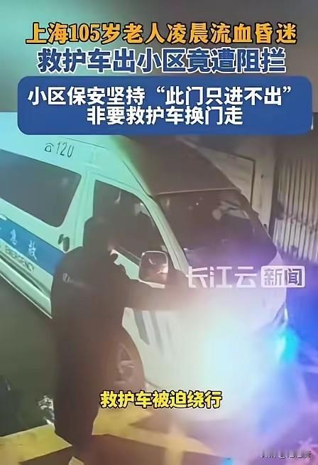 “必须严惩!”上海,105岁老人在家中摔倒,流血昏迷,家人急忙拨打了急救电话,谁知,当救护车载着老人准备出小区时,小区保安以“东门只进不出”为由,坚持让救护车换个门走,救护车只能绕行,被硬生生耽误5分钟! ​ 这位105岁老人虽然年龄比较大,但除了行动不便外,身体还算健朗,平时家人都很孝顺她。 ​事发当晚,老人的家人都睡了,本来她也睡了,可能是因为晚上吃的有些咸,她喝了不少水,也不知睡了多久就感觉想上厕所,之后,她小心摸索着起床上厕所,等上完厕所又想去客厅倒点水喝。 不料,由于屋子里比较黑,老人又怕打扰家人,所以没呼喊他们帮忙,在桌子边倒水时,一个不小心摔倒了,额头正好磕到了旁边椅子边沿上,一下子疼得老人直呻吟,家人被惊醒后,果断起来查看老人伤势,发现她额头一长条伤口,流了很多红,他们赶紧拨打了急救电话。 ​没多久,救护车就赶到老人家里,带着她就准备往医院赶,万万没想到,救护车进小区时畅通无阻,等她带着老人出去时,却被保安拦下了,不让他们走。 ​保安的说法是,当时那个门是东门,而物业公司有规定,东门只进不出,让他们从前大门出去。 ​无奈,救护车只能在小区绕行到前大门出去,出了小区又绕了一圈,这一耽误,白白浪费了5分钟,可能有人觉得5分钟不算久,但懂点急救知识的人都知道,这5分钟有多致命。中华医学会早就科普过,心搏骤停的“黄金4分钟”里,每延迟1分钟存活率就下降10%,5分钟足以让脑细胞发生不可逆损伤。就算老人没有心跳骤停,头部外伤的止血、防感染也容不得半点拖延,这耽误的哪里是时间,分明是在透支生命。 更讽刺的是,很多小区的管理规定里都明确写着“应急车辆无需报备,直接放行”,丽水嘉园的管理办法甚至专门强调救护车可优先通行。可到了这位保安这里,“东门只进不出”的死规矩,竟然比百岁老人的命还重要。 有人说保安只是打工人,怕扣工资没错,该怪物业公司。这话看似有道理,却忽略了最基本的人性底线。杭州有物业遇到业主晕倒,保安秒启动应急预案,全程陪护送医,这才是物业该有的样子。真正的规则应该是“生命优先”,而不是让保安在“扣工资”和“救人命”之间做选择。物业公司如果连“紧急情况灵活处置”都没教给保安,这样的管理本身就是失职。 保安手握的不是“守门权”,而是小区居民的“安全权”。上海金海街道的物业案例早就证明,完善的应急联动机制有多重要,遇到紧急情况,变通才是负责任的表现。105岁的老人,一辈子经历了多少风雨,最后却要为小区的死规矩买单,这实在说不过去。 规矩是为了维护秩序,而不是成为人命关天时刻的绊脚石。如果一份规定需要让人放弃基本的人道主义,那这份规定本身就该被修改。保安怕扣工资可以理解,但在“可能救人命”和“肯定不扣钱”之间,但凡有点良知,都知道该怎么选。 万幸的是老人身子骨硬朗,最终没出大碍,但这一次的幸运,不代表下一次还能这么侥幸。