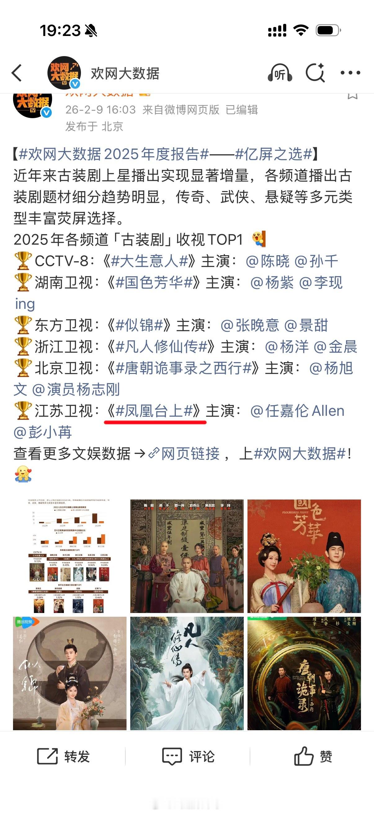 任嘉伦主演《凤凰台上》拿下2025年江苏卫视「古装剧」收视TOP1