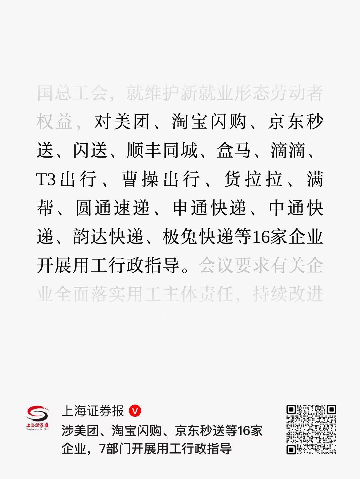 人社部等7部门对美团、淘宝闪购、京东秒送、闪送、顺丰同城、盒马、滴滴、T3出行、曹操出行、货拉拉、满帮、圆通速递、申通快递、中通快递、韵达快递、极兔快递等16家头部平台企业和快递企业开展用工行政指导。